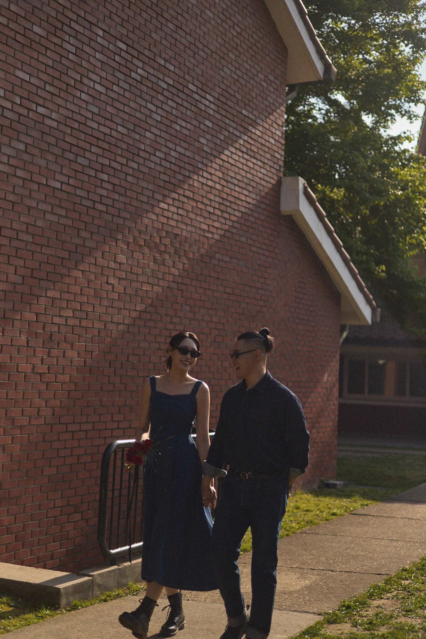 포인트 소품: 붉은 벽돌 배경에 맞춰 준비한 붉은 장미 부케는 신의 한 수였습니다. 자칫 밋밋할 수 있는 캐주얼 룩에 선명한 컬러 포인트를 주어 사진의 완성도를 획기적으로 높였습니다.