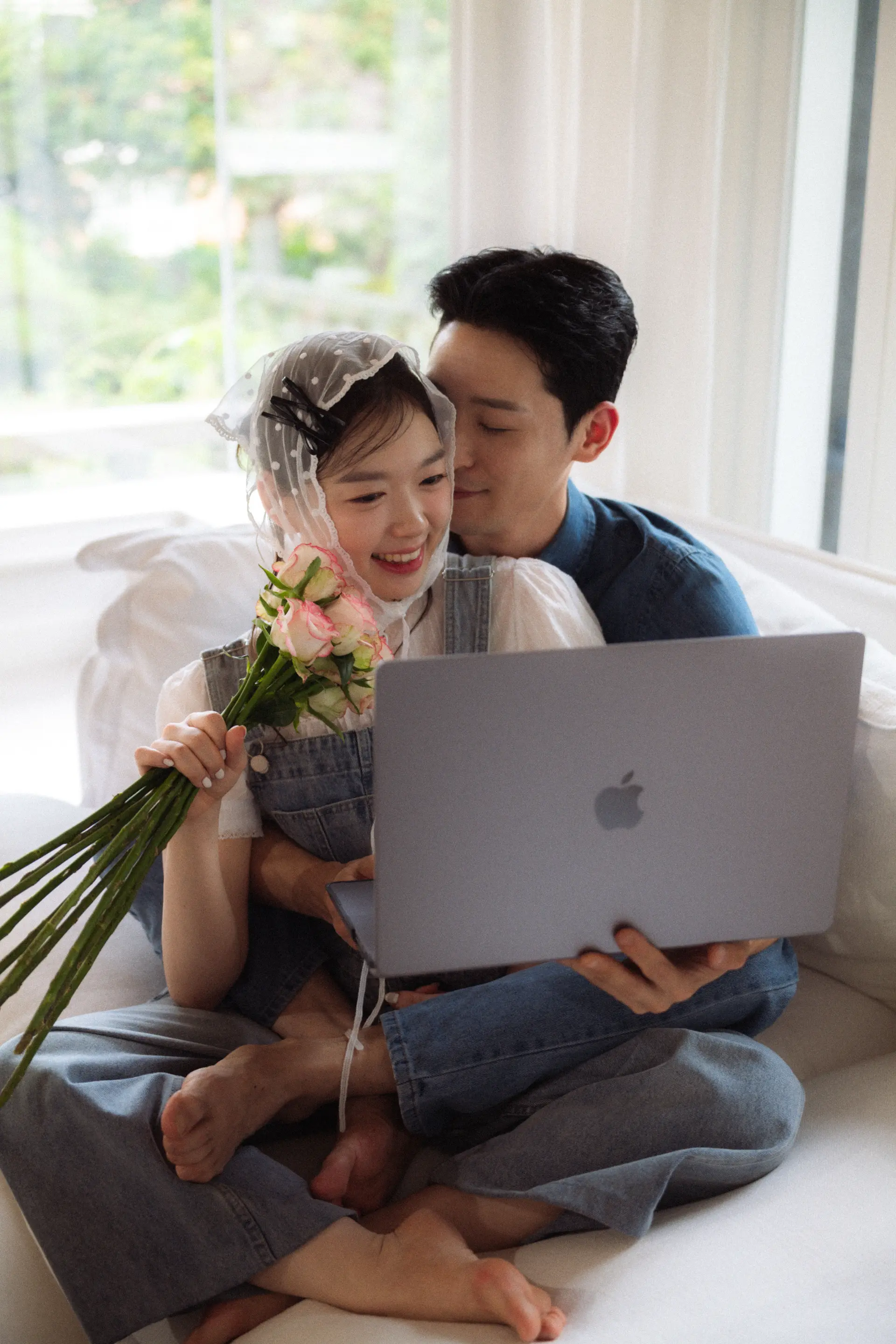 스튜디오 공간으로 이동한 실내 촬영은 키치한 가구, 거울 셀카, 커플 무드 연출 컷 등으로 감성적인 분위기를 연출했습니다. 특히 청청 패션 + 두건 등 빈티지 소품을 더해 재미있고 유니크한 화보 느낌으로 완성되었습니다.