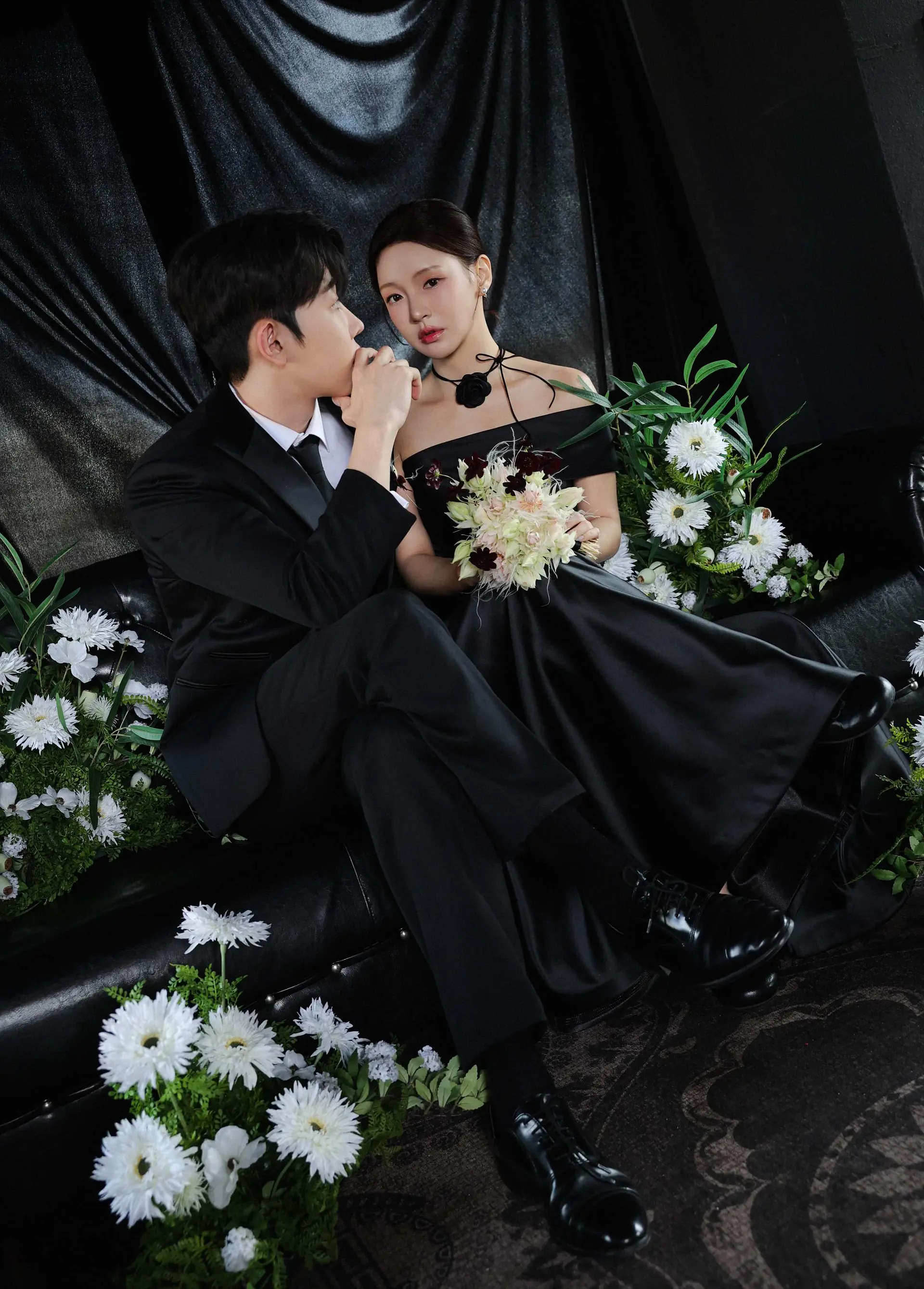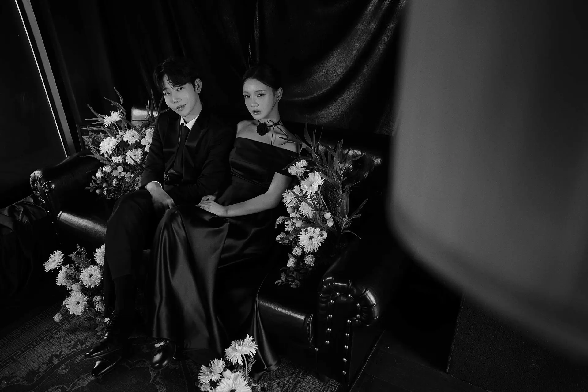 포인트: 조화 센터피스를 소품으로 더해 부드러운 포인트를 주면서도, 블랙 배경과 드레스가 가진 분위기를 해치지 않도록 조화를 맞췄습니다.