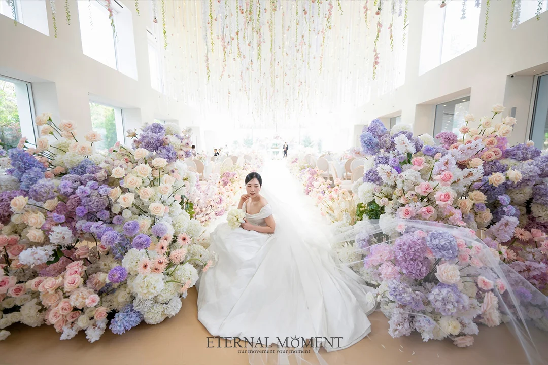 • 메인홀의 품격: 은은한 화이트와 파스텔 톤 중심의 플라워 데코는 어떤 드레스와도 완벽한 조화를 이룹니다. 높은 층고와 긴 버진로드는 신부님의 입장 장면을 한층 드라마틱하게 만들어줍니다.