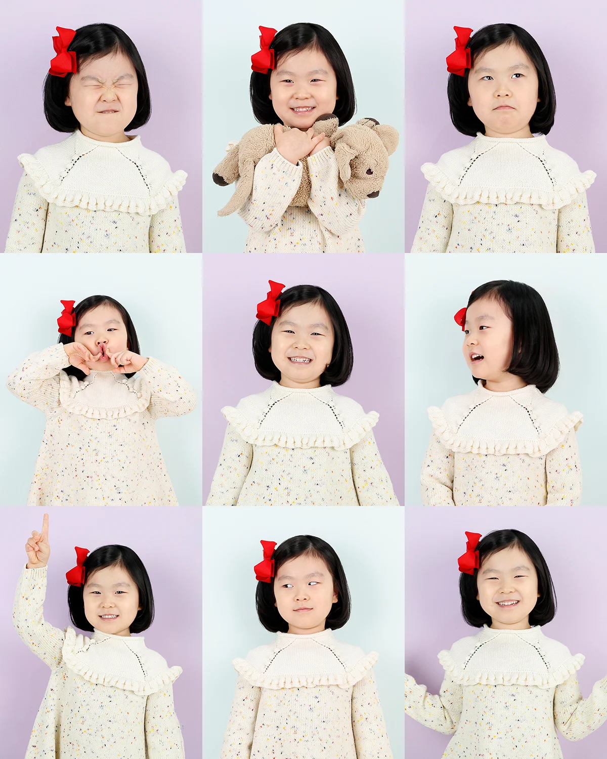 감정의 지도: 활짝 웃는 미소부터 장난기 가득한 윙크, 새침한 입술, 호기심 어린 눈빛까지. 시간이 지나 다시 꺼내 보았을 때 그 시절 아이의 성격이 고스란히 읽히는 성장 기록이 됩니다.