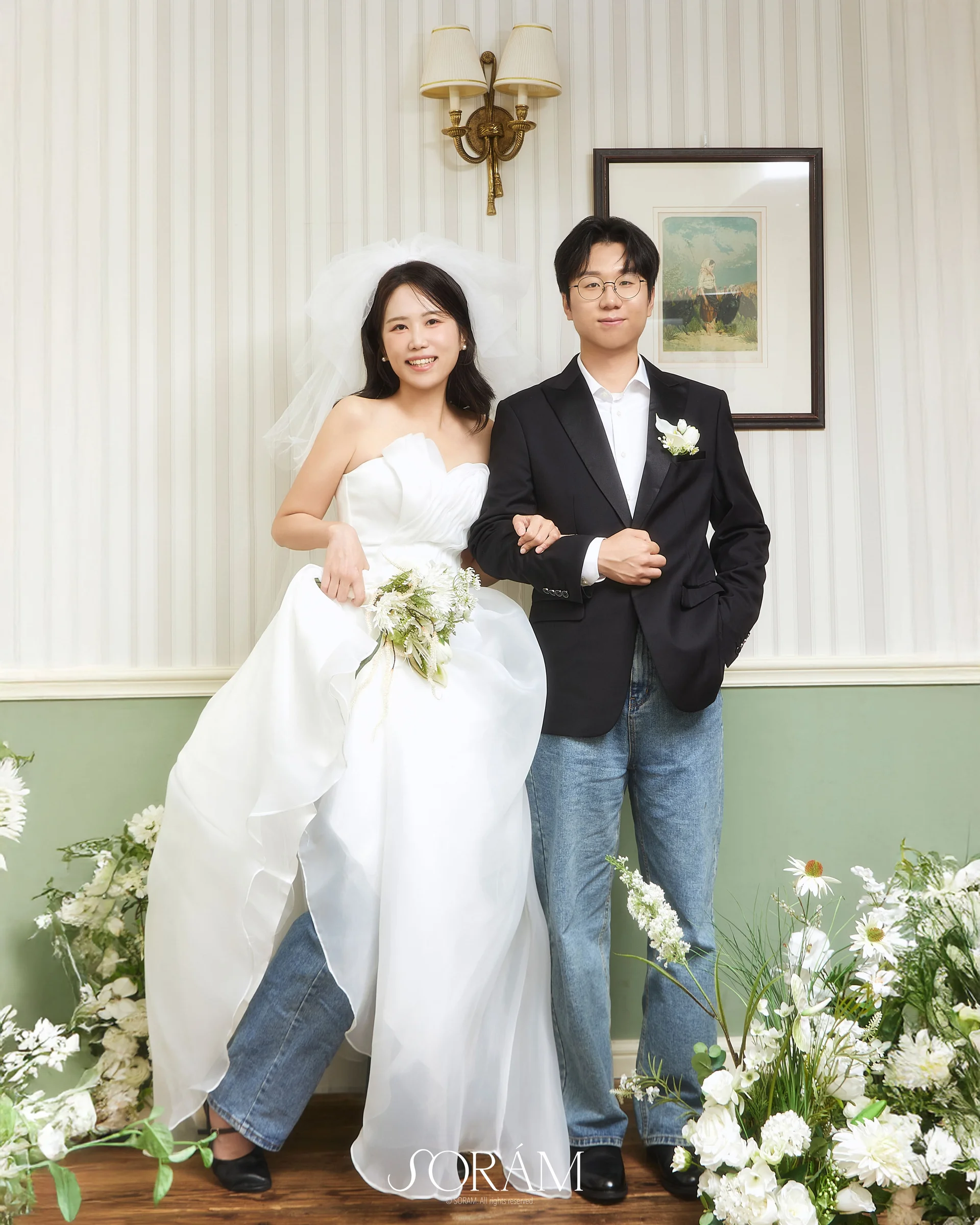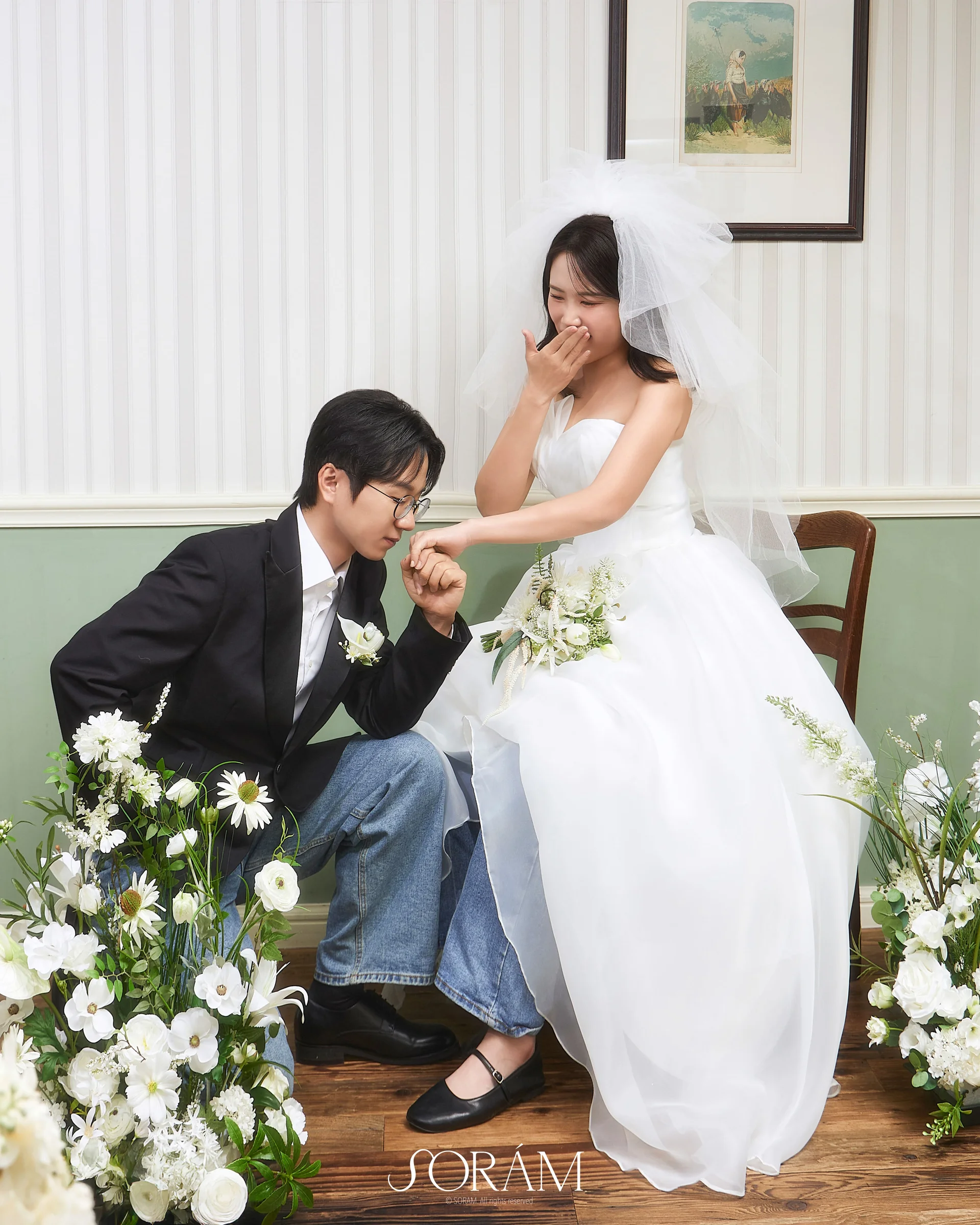 자연광의 조화: 창을 통해 들어오는 부드러운 채광은 인물의 표정을 더욱 깊이 있게 만들어주며, 인위적이지 않은 세련된 웨딩 화보를 남기기에 최적입니다.