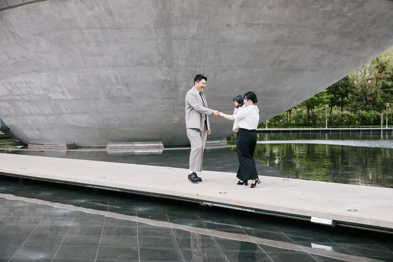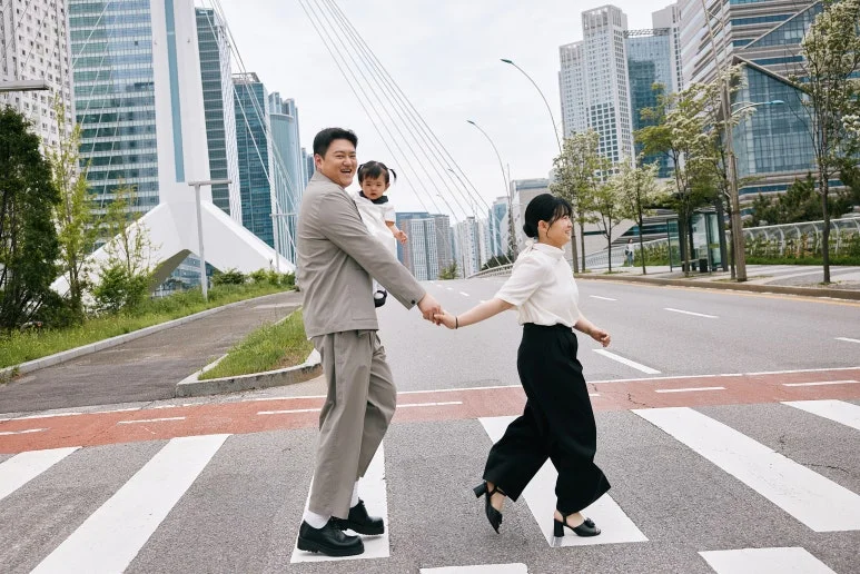 호텔 앞 횡단보도를 자연스럽게 걷는 가족 컷은 마치 일상 영화의 포스터 같은 느낌을 줍니다. 이어지는 트라이보울 배경 컷은 송도만의 이색적이고 세련된 아우라를 사진에 담아줍니다.