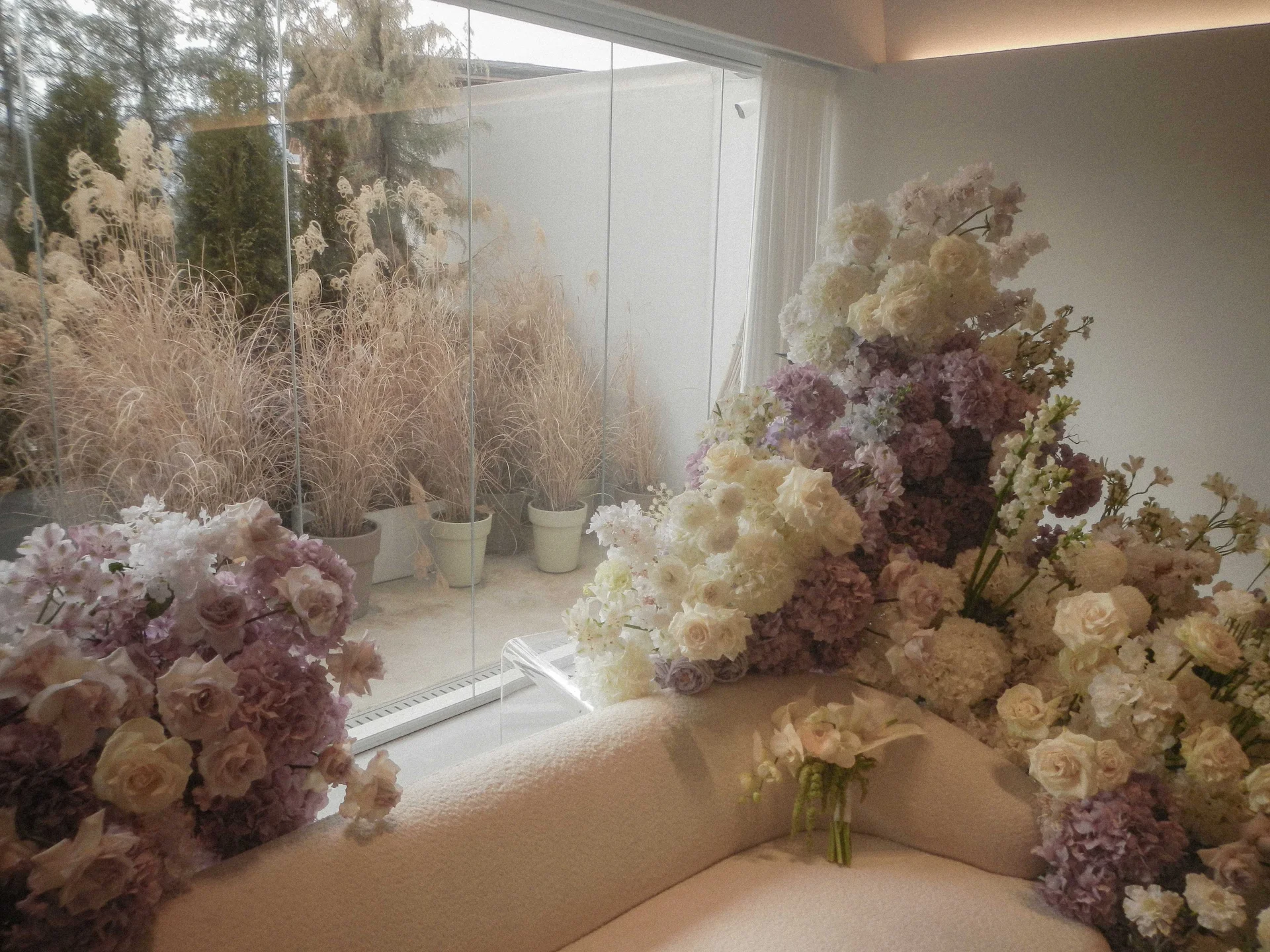천장에서 아래로 길게 늘어진 화이트 플라워 장식은 마치 영화 <트와일라잇>의 숲속 결혼식을 연상케 합니다. 화이트 톤이 강한 공간 특성상 인물에게 시선이 집중되는 효과가 탁월하며, 오프그리드의 섬세한 라이팅 제어를 통해 신부님의 실루엣을 가장 우아하게 박제했습니다.