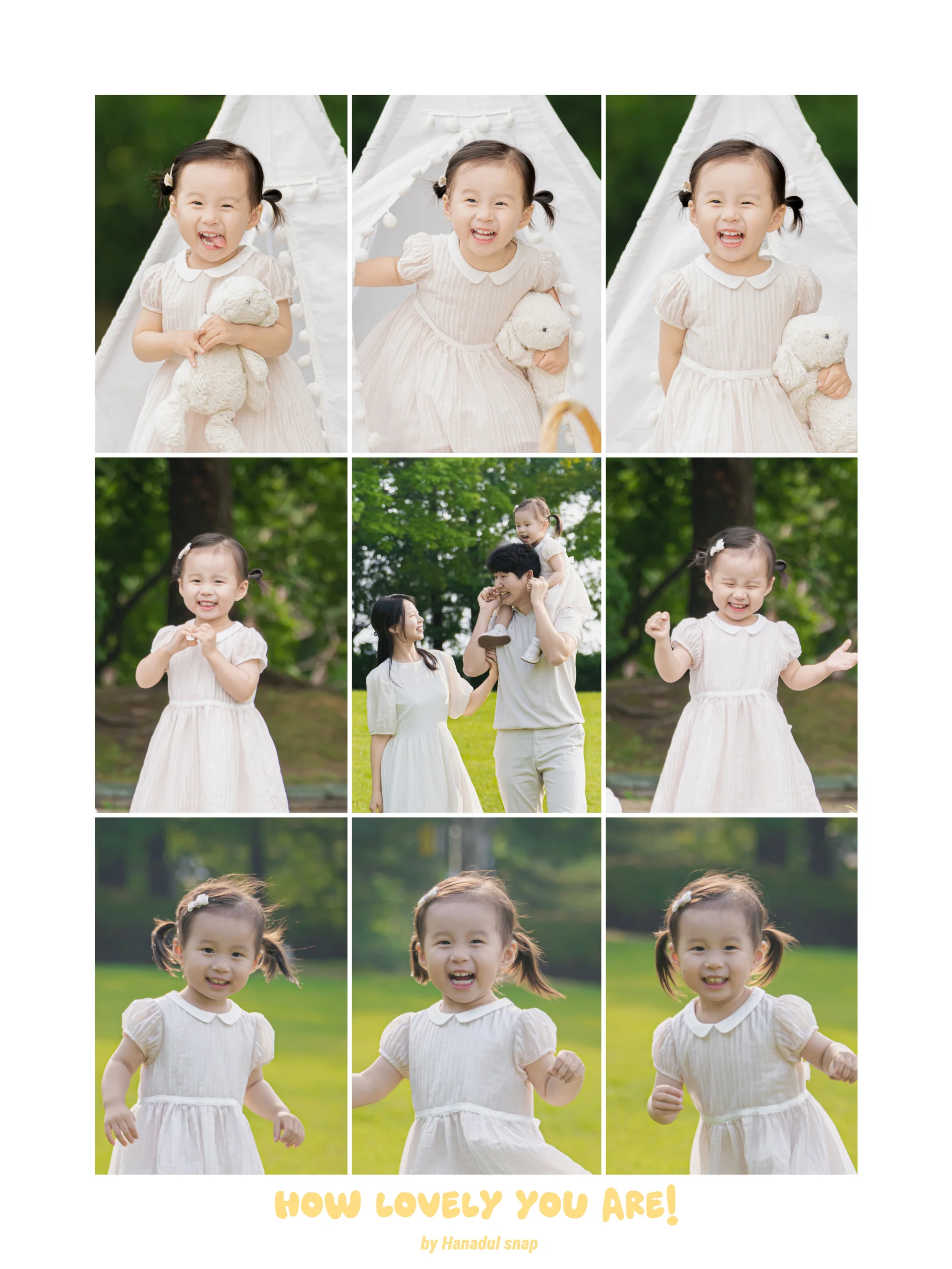 자연스러운 연출: 인위적으로 미소를 지으라고 강요할 필요가 없습니다. 부모님과 손을 잡고 걷고, 풀밭에 앉아 하늘을 바라보는 모든 찰나가 가장 완벽한 연출이 됩니다.