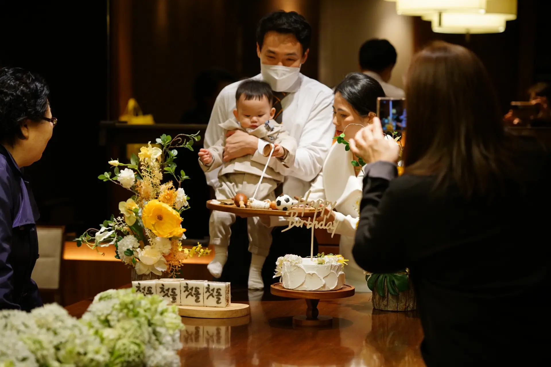 객실에서 최상의 컨디션을 확보한 뒤 레스토랑으로 자리를 옮겨 돌잡이 이벤트와 가족 식사 장면을 담습니다. 이미 작가와 친해진 아이는 많은 사람들 앞에서도 한결 편안한 표정을 보여주게 됩니다.