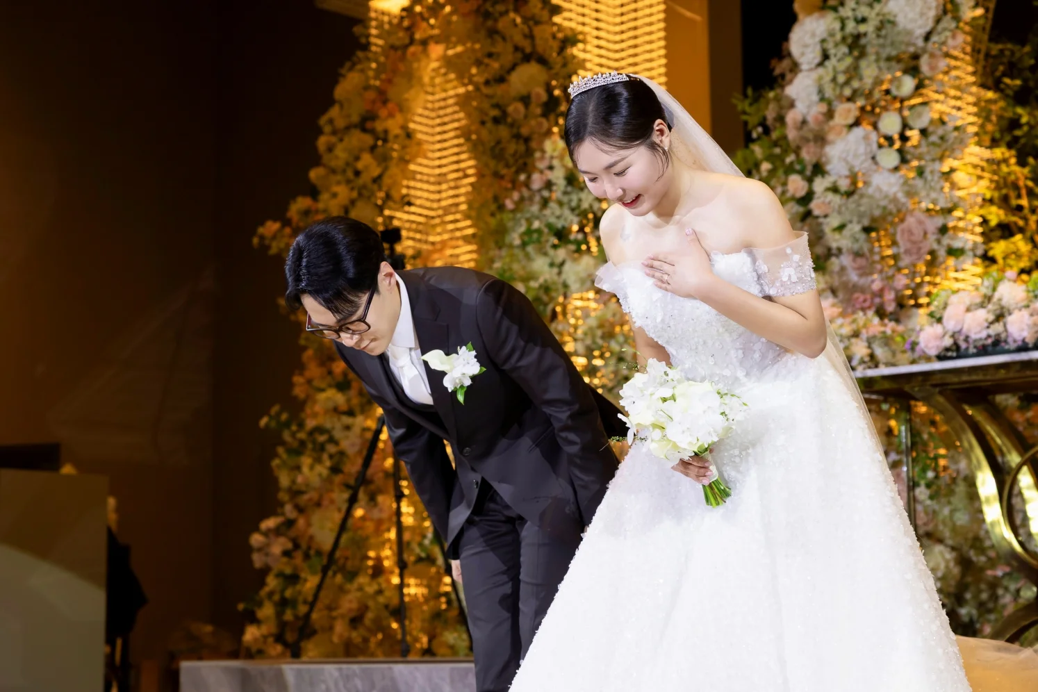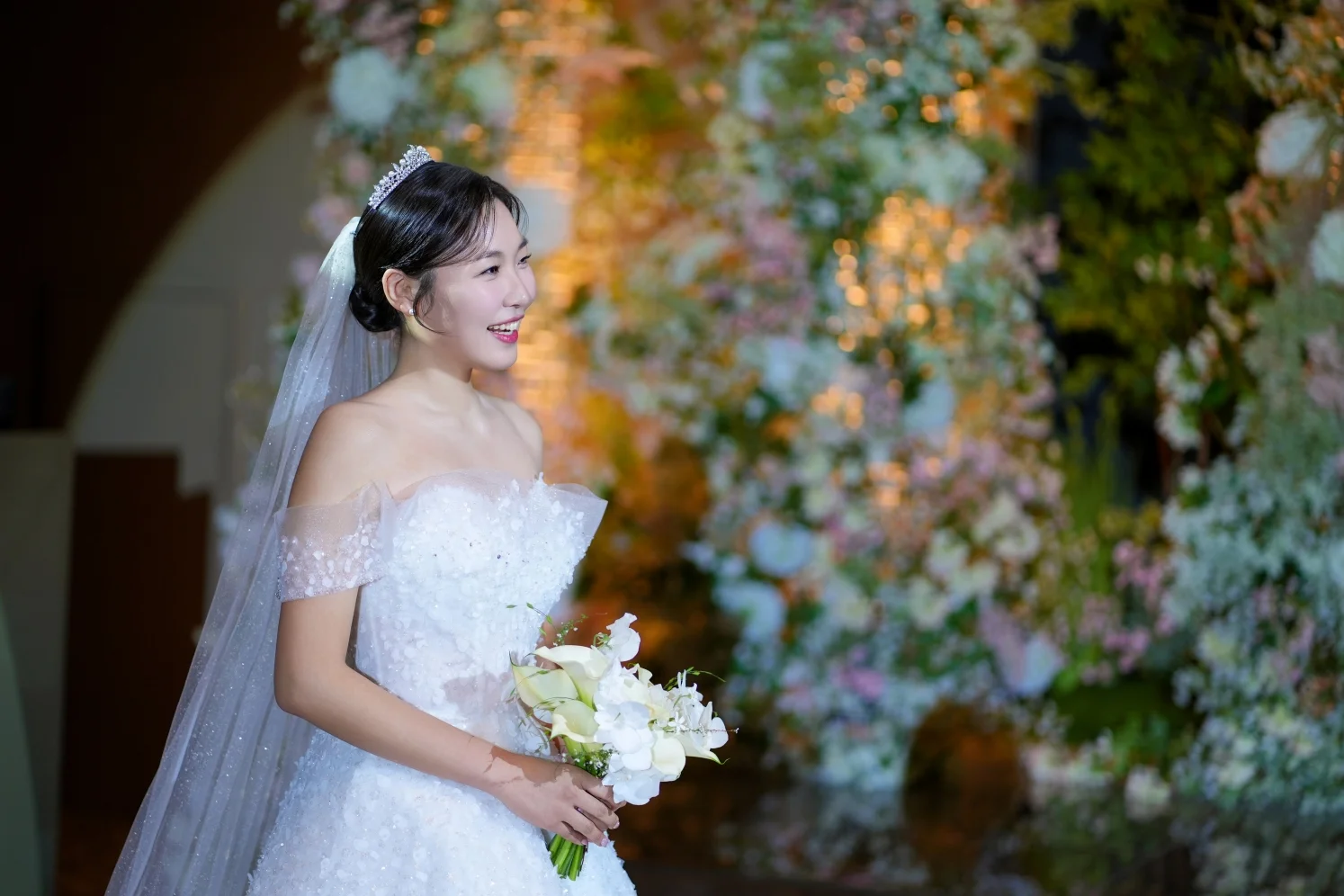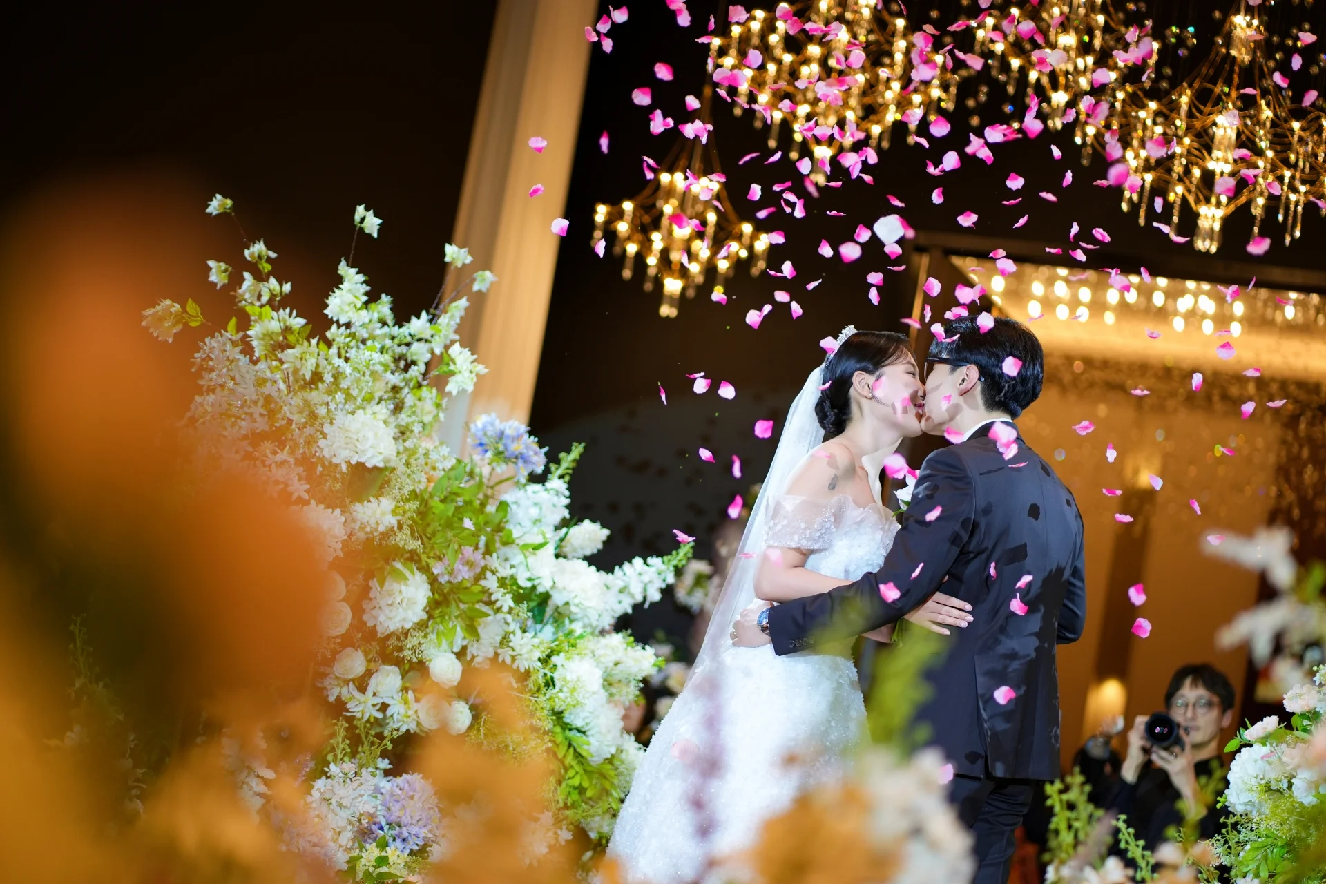A. 규수당은 전체적으로 아늑한 톤을 지향하지만, 인물에게 집중되는 핀 조명이 매우 잘 설계되어 있습니다. 이터널모먼트는 이 명암 대비를 예술적으로 활용하여 신부님의 드레스 디테일과 피부 결을 더욱 맑고 입체적으로 표현해 드립니다.