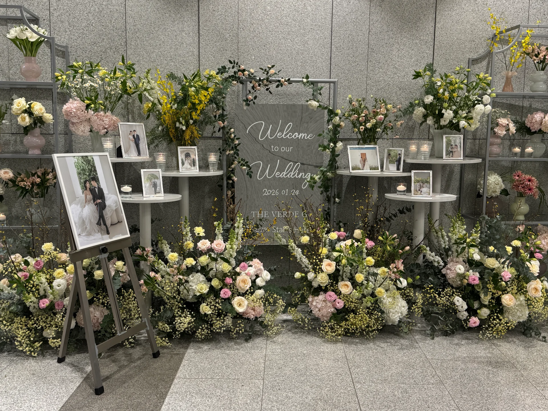 로비 디테일: 넓은 로비는 청첩장, 예물 등 소중한 소품들의 디테일 컷을 담기에 훌륭한 배경이 됩니다. 특히 기둥 형태로 디자인된 유니크한 포토테이블은 하객들의 시선을 자연스럽게 이끄는 세련된 미장센을 완성합니다.