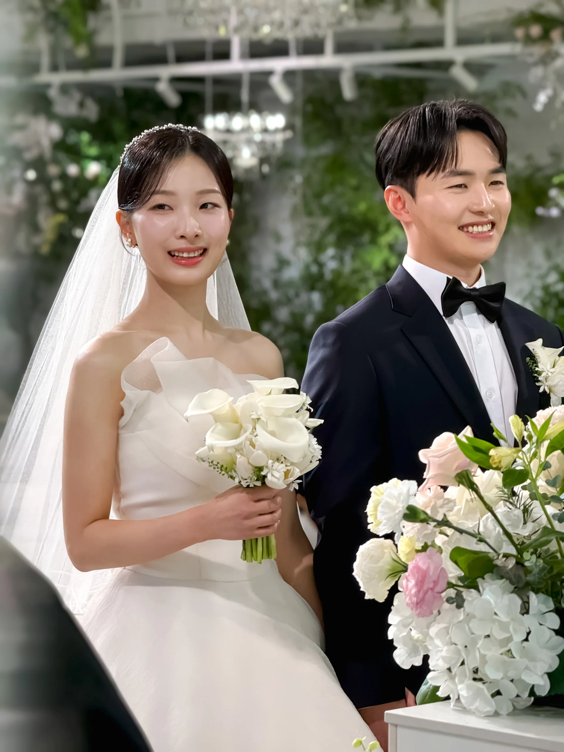 단상 연출: 우아한 샹들리에와 높은 꽃기둥이 배치된 단상은 예식의 무게감을 잡아주며, 아이폰으로 담았을 때 입체감 있는 구도를 선사합니다.