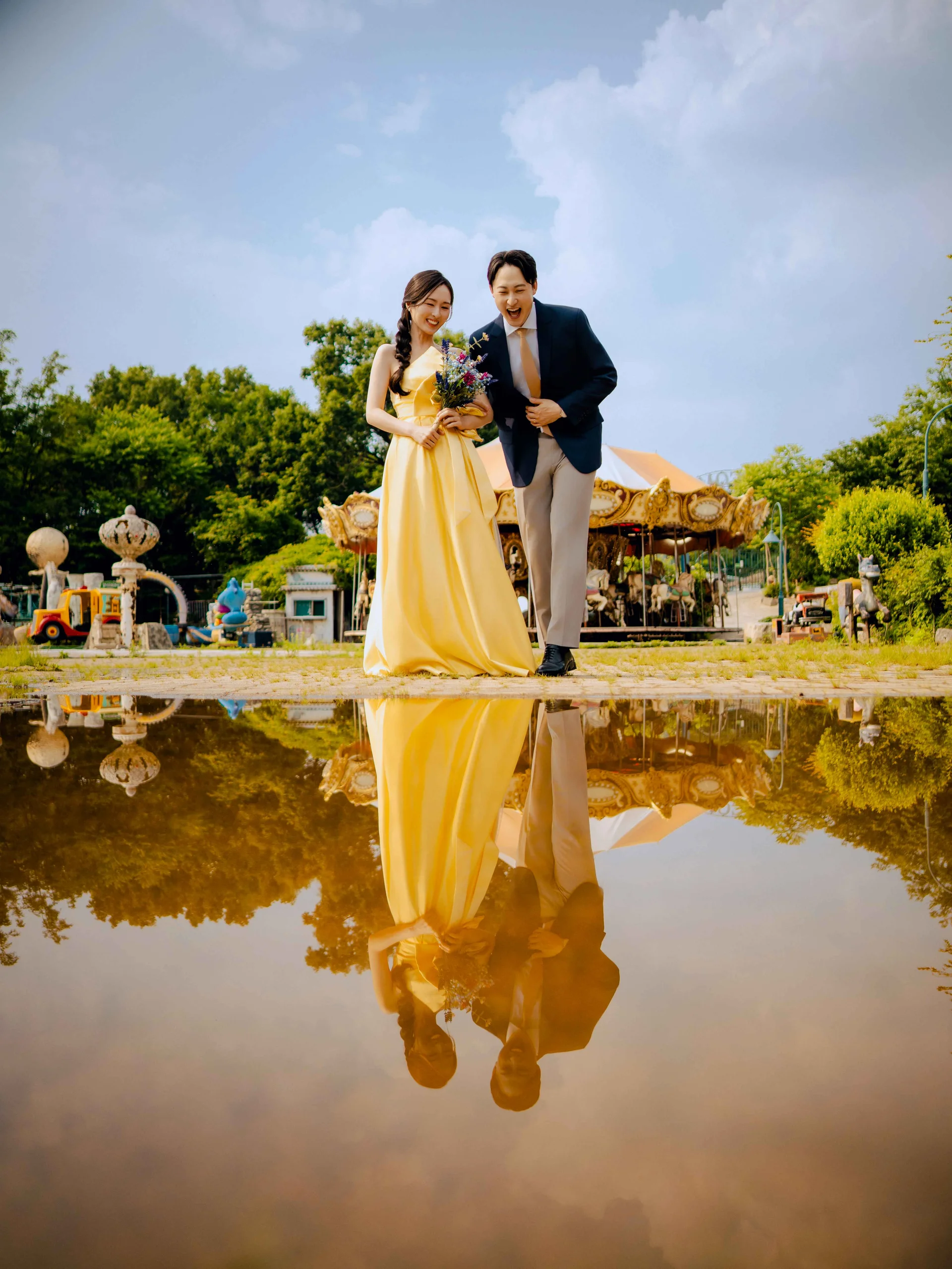 바닥의 물웅덩이를 활용한 반영 컷은 유운필름이 강력 추천하는 연출입니다. 세상에 단둘만 남은 듯한 신비롭고 고요한 분위기를 만들어내며, 맑은 날과 흐린 날 각각 다른 매력의 사진이 탄생합니다.