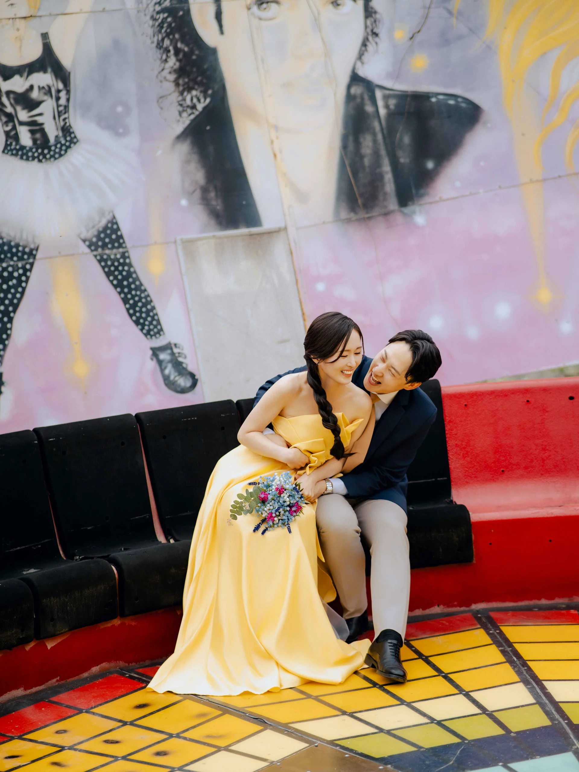 조금 더 익살스럽고 사랑스러운 느낌을 원하신다면 알록달록한 놀이기구들을 배경으로 활용해 보세요. '놀러 온 커플'처럼 자연스럽게 장난치는 모습이 사진에 생동감을 더해줍니다.