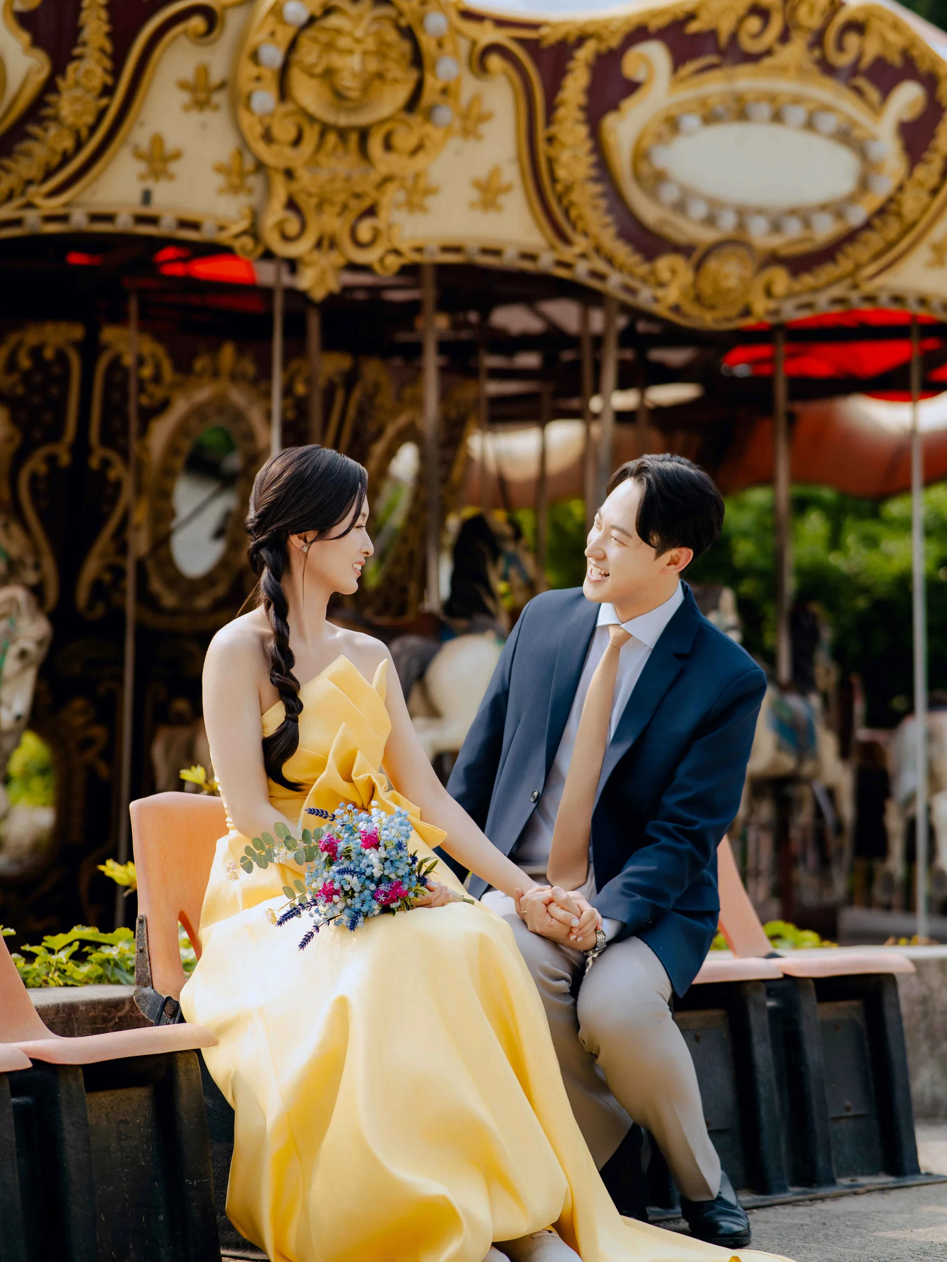 용마랜드의 상징인 회전목마는 빠질 수 없는 스팟입니다. 빛바랜 금장 장식과 목마의 실루엣은 그 자체로 레트로 감성을 완성해 줍니다. 서로를 바라보는 두 분의 눈빛을 담기에 이보다 완벽한 배경은 없습니다.