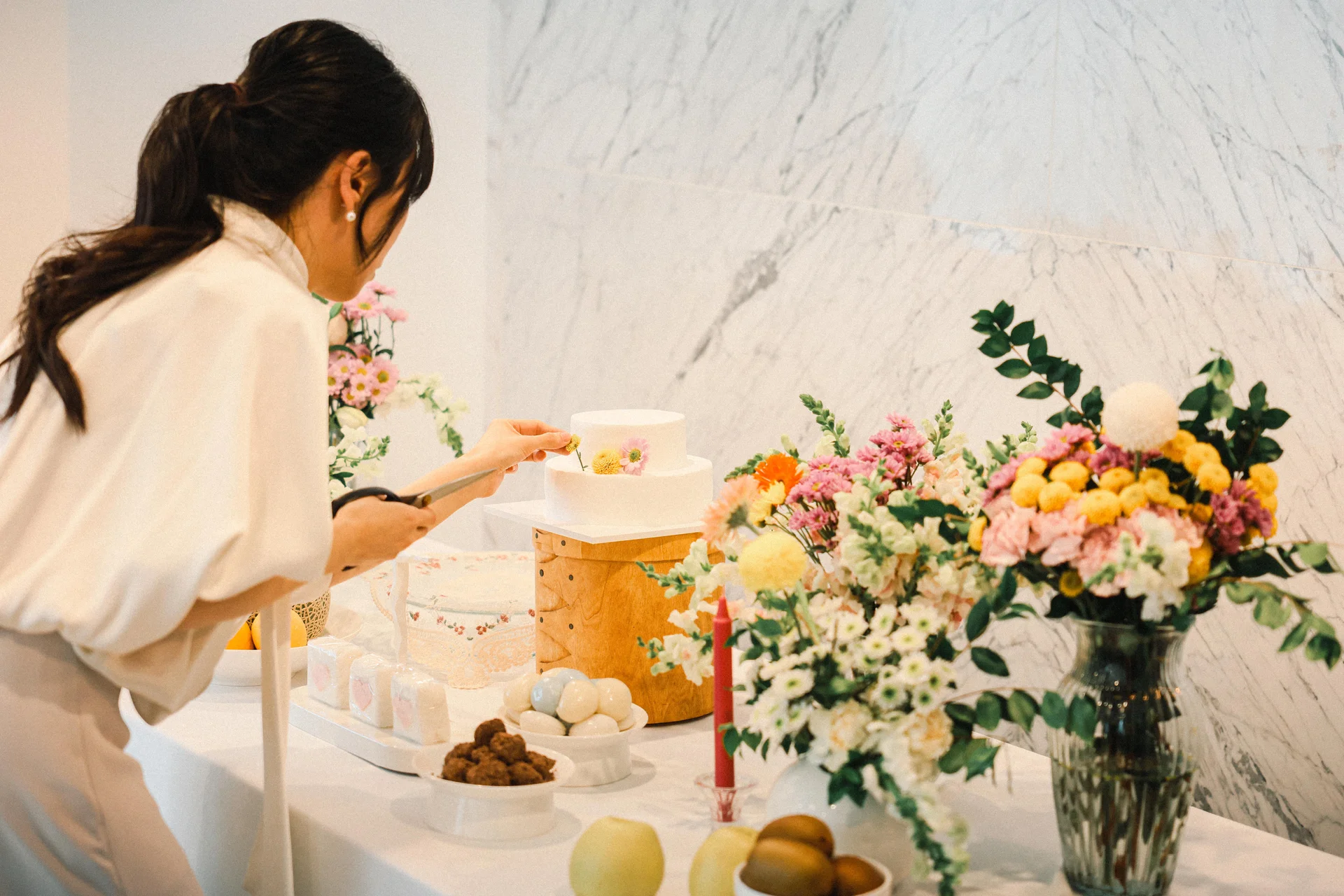 스타일링 팁: 대리석 배경과 잘 어우러지는 생화와 촛불 장식을 활용해 보세요. 은은한 색감의 돌상은 아기의 컨디션과도 부드럽게 조화를 이루며 세련된 무드를 완성합니다.