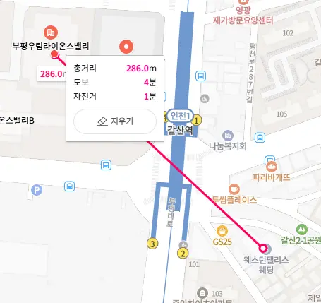 접근성: 지하철 7호선 갈산역 2번 출구에서 도보 1분 거리에 있어 하객 편의성이 매우 뛰어납니다. (주차는 하객 3시간 무료, 횡단보도 건너 도보 이동 필요)