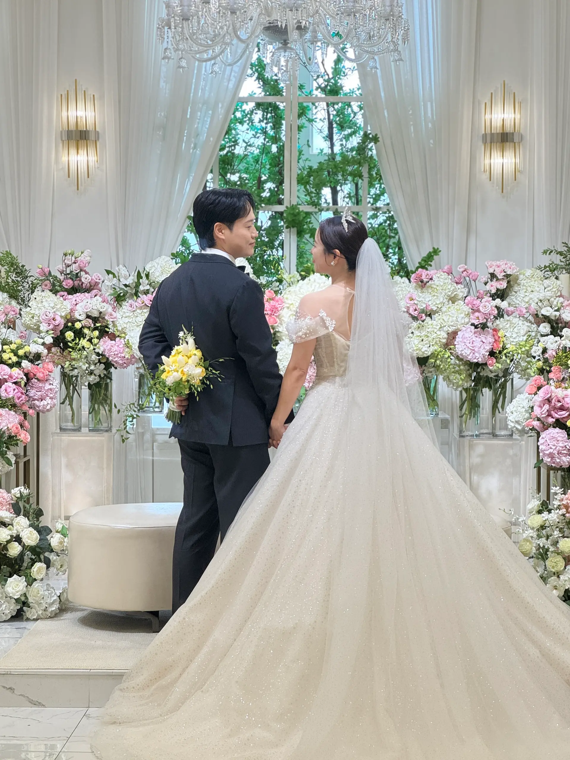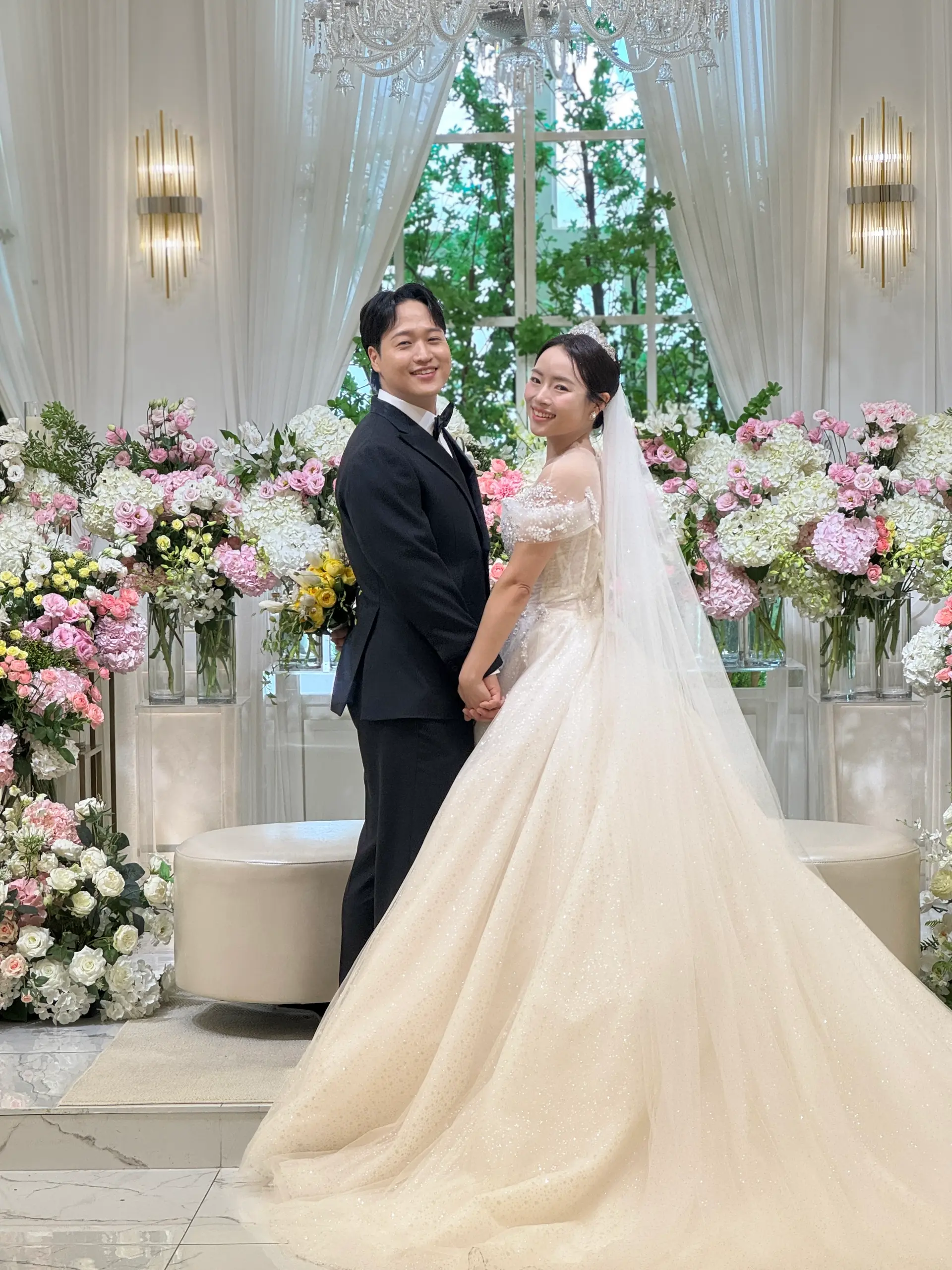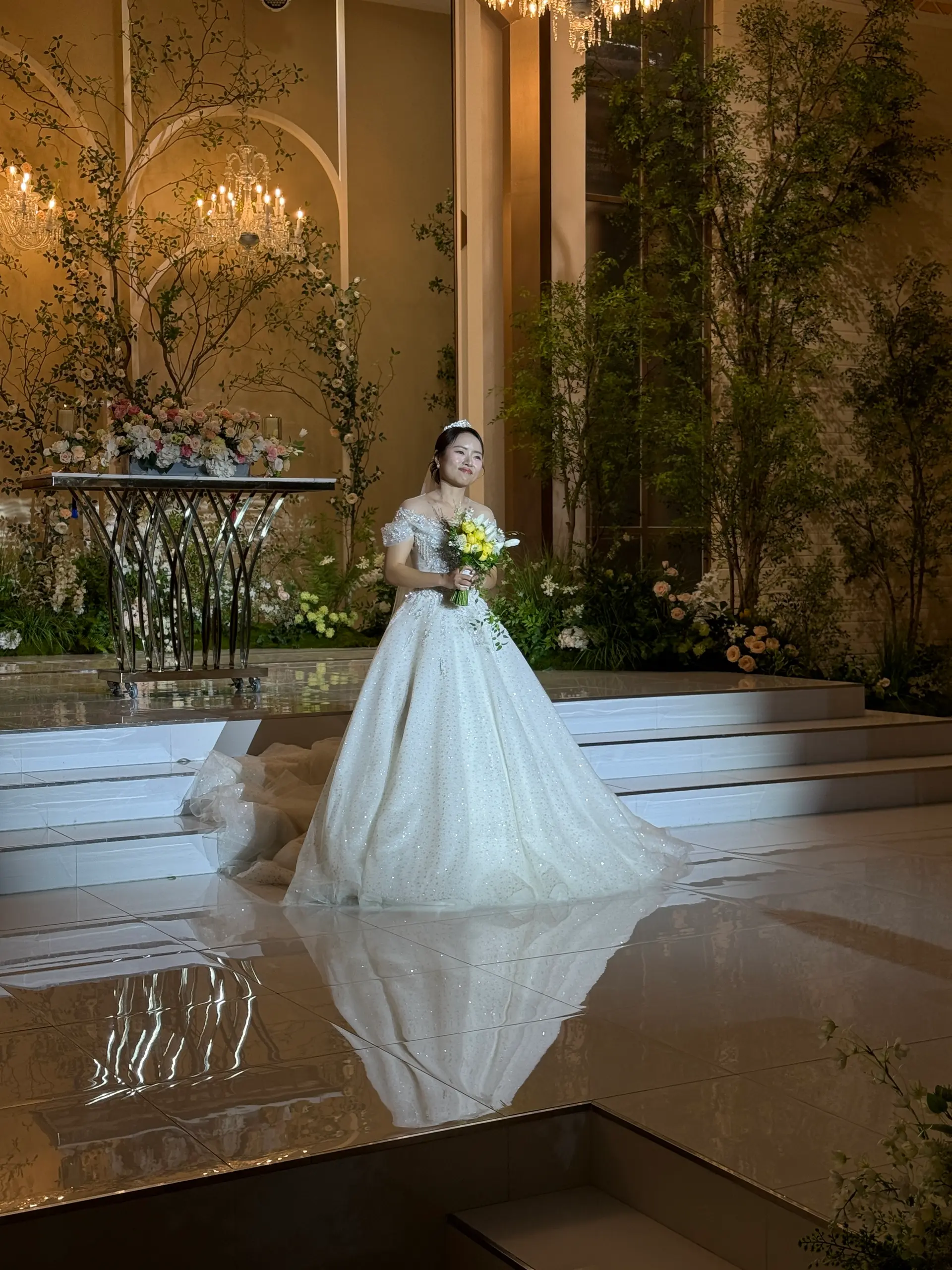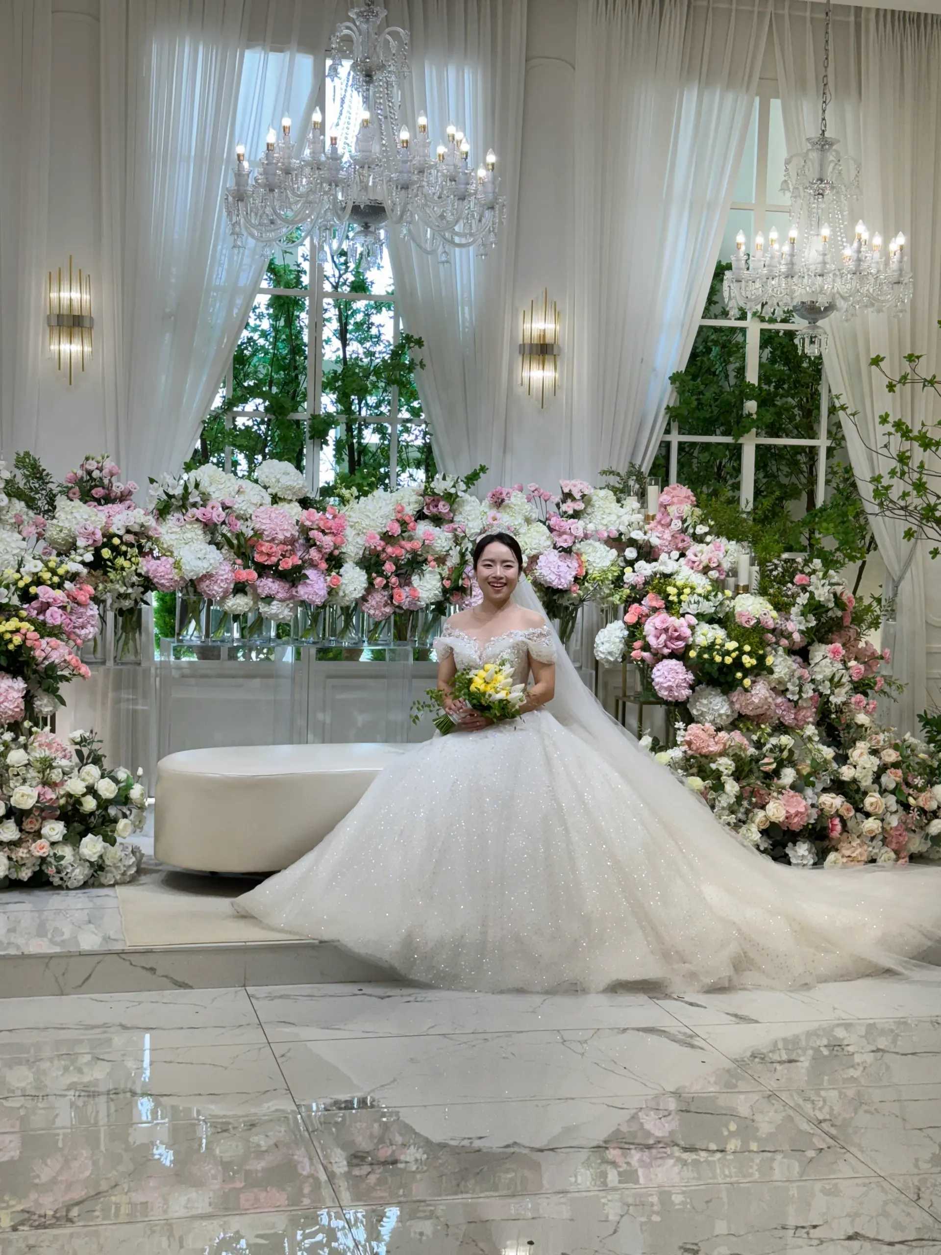 촬영 포인트: 샹들리에 조명과 단차 있는 소파는 신부님 중심으로 시선을 집중시키는 연출에 적합하며, 아이폰 감성컷이 잘 나옵니다.