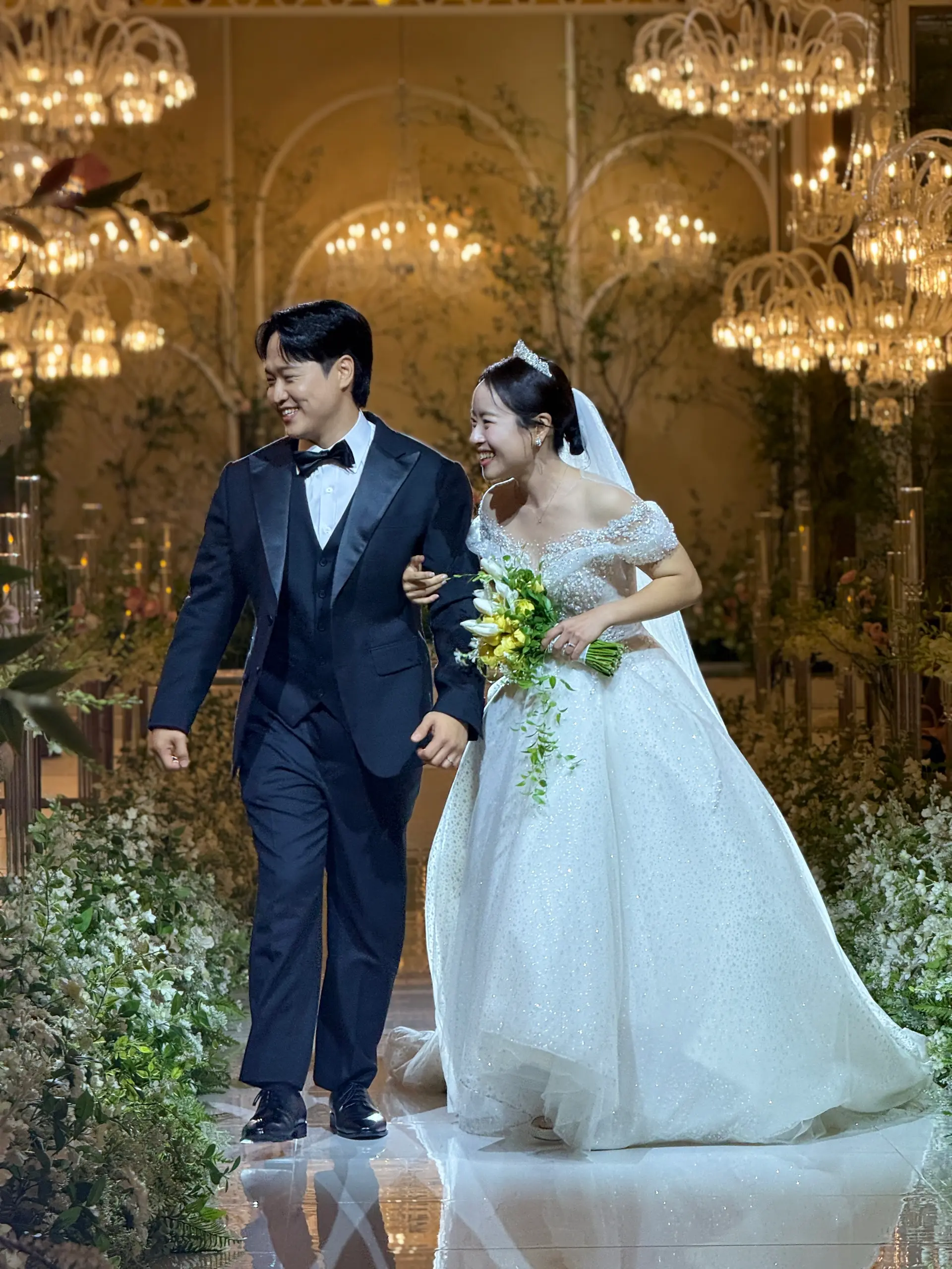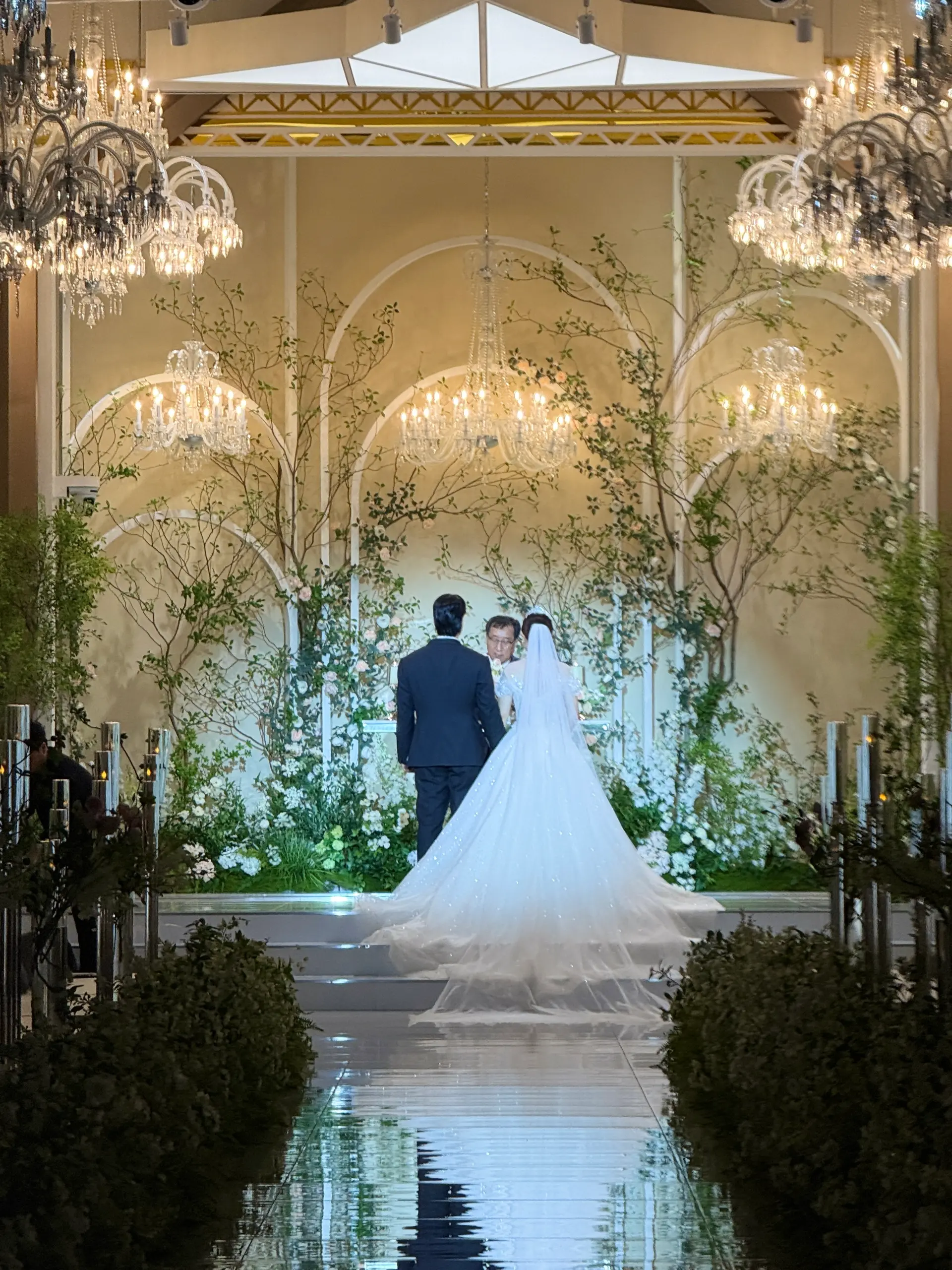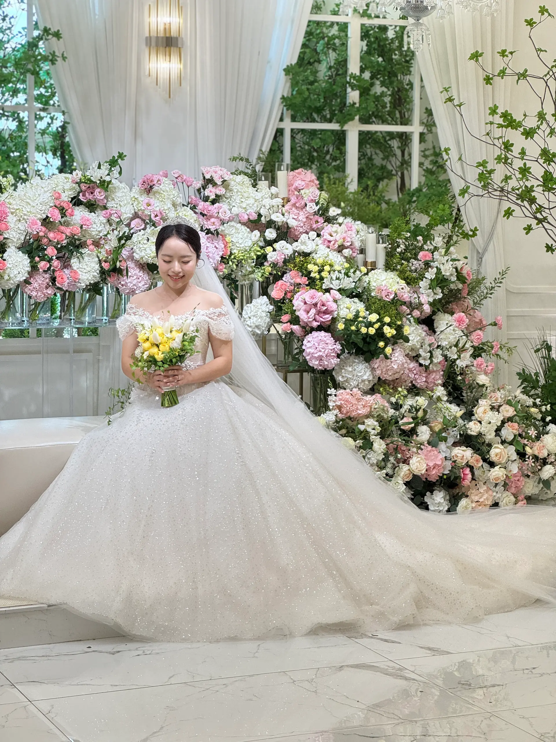 촬영 포인트: 샹들리에 조명과 단차 있는 소파는 신부님 중심으로 시선을 집중시키는 연출에 적합하며, 아이폰 감성컷이 잘 나옵니다.