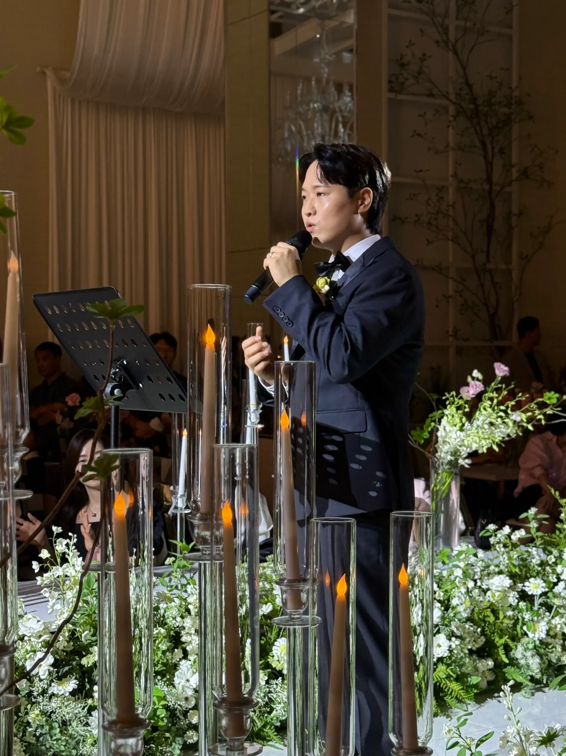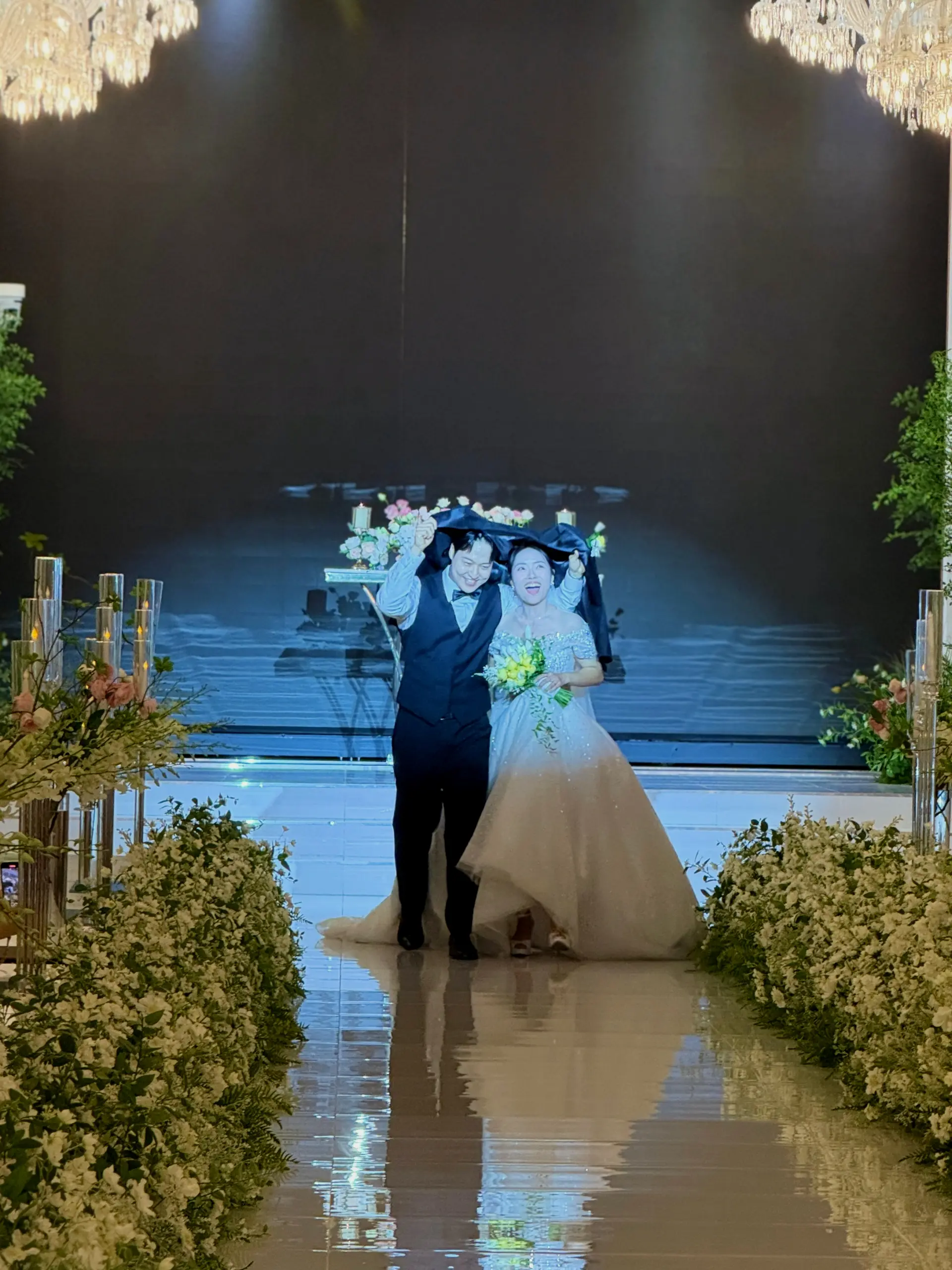 조명 연출: 밝은 톤의 조명과 깔끔한 배경 덕분에 아이폰스냅으로도 선명하고 맑은 사진이 잘 나옵니다. 특히 입·퇴장 시에는 암전 + 핀조명 연출로 신랑신부 중심으로 분위기가 집중됩니다.