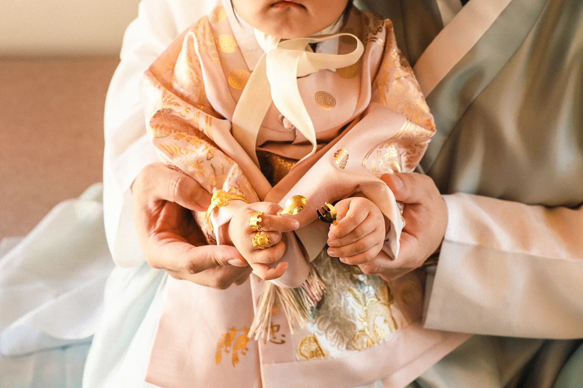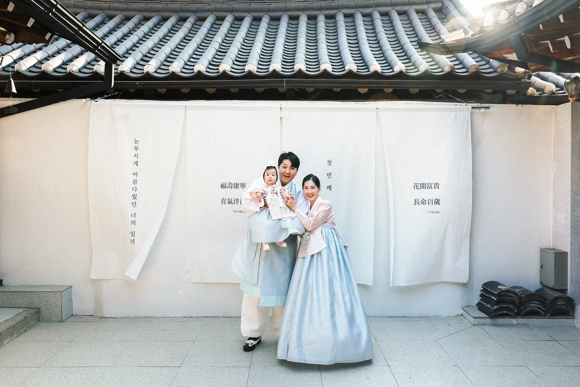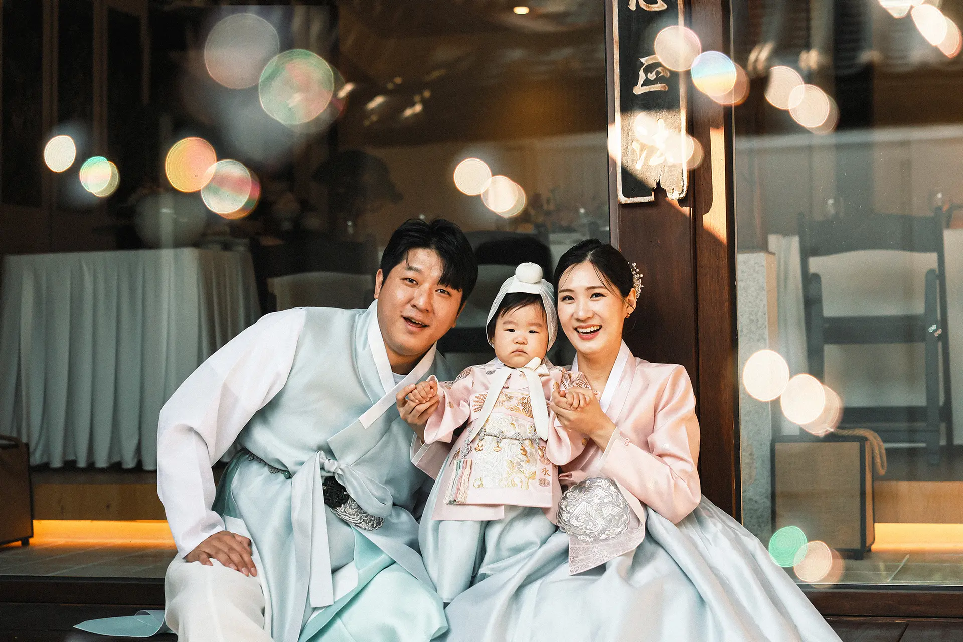 종로 무월관 돌잔치에서는 은은한 톤의 가족 한복을 추천합니다. 전체적으로 너무 튀지 않으면서도 한복의 고운 주름과 아기의 맑은 얼굴빛이 조용히 어우러져 따뜻하고 자연스러운 사진을 완성할 수 있습니다.