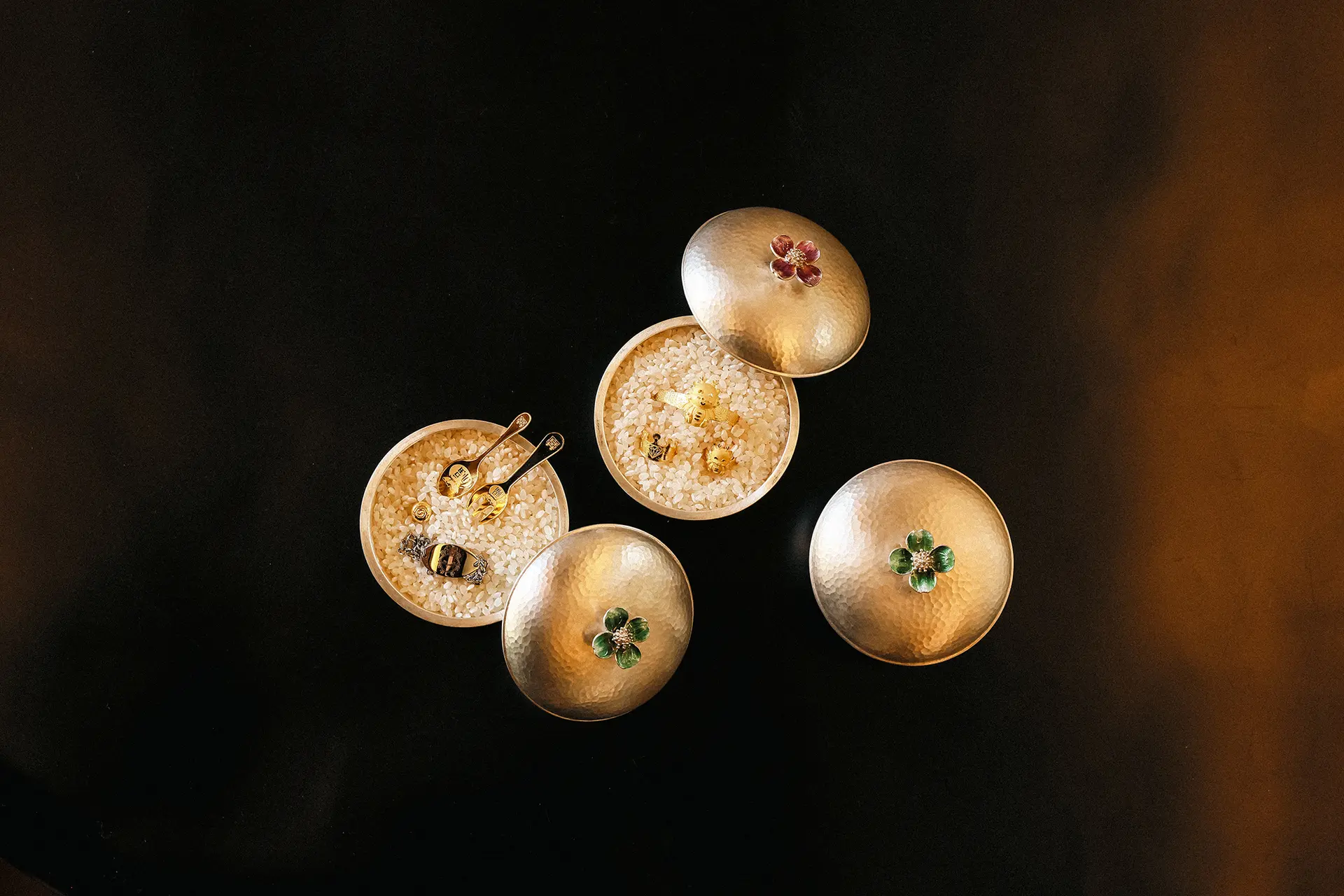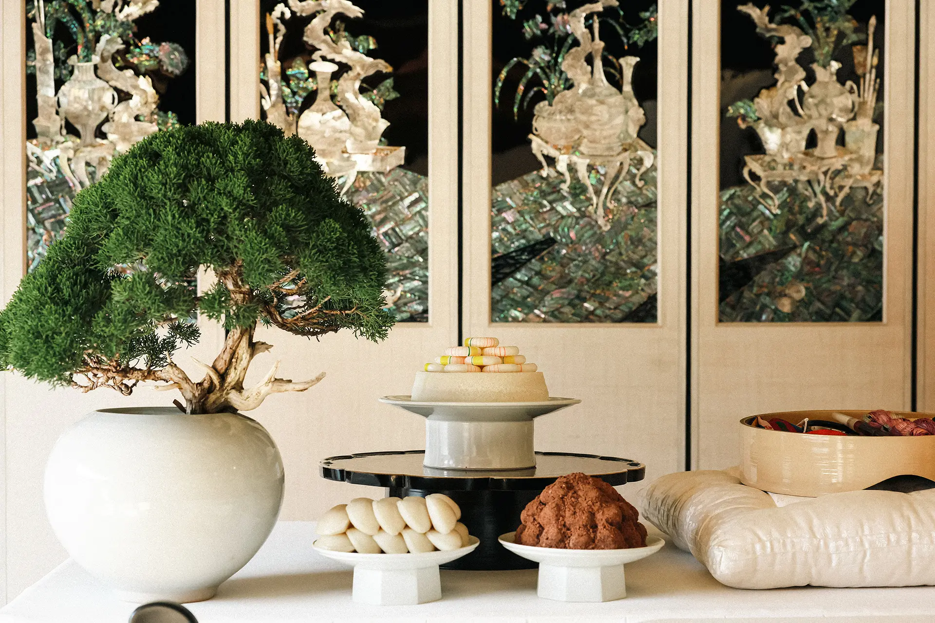 돌상: 심플하면서도 정갈한 구성의 고급스러운 돌상(특히 자개병풍)이 전통 한옥 감성을 완성합니다.