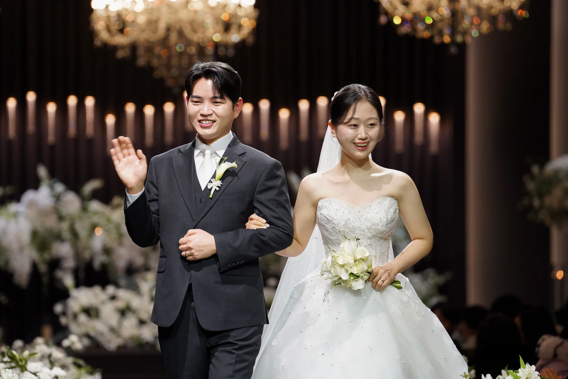 시네마틱 조명: 은은한 핀 조명과 화이트톤 플라워 데코가 어우러져 인물 집중도가 매우 높습니다. 플로브스냅은 단순히 밝게 찍는 것에 그치지 않고, 홀 특유의 깊이 있는 톤을 유지하면서 인물의 생동감을 살리는 ‘톤 컨트롤’에 집중합니다.