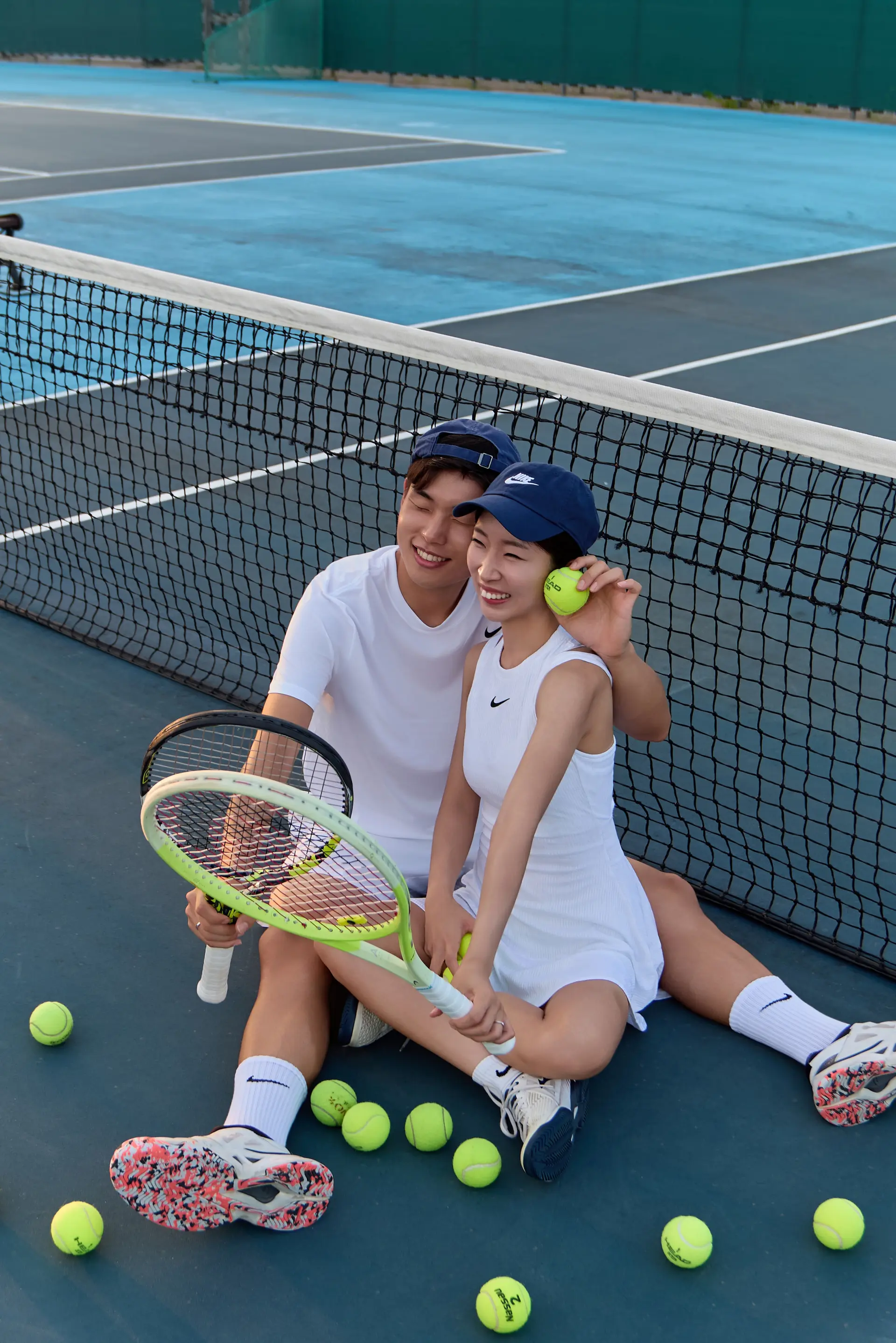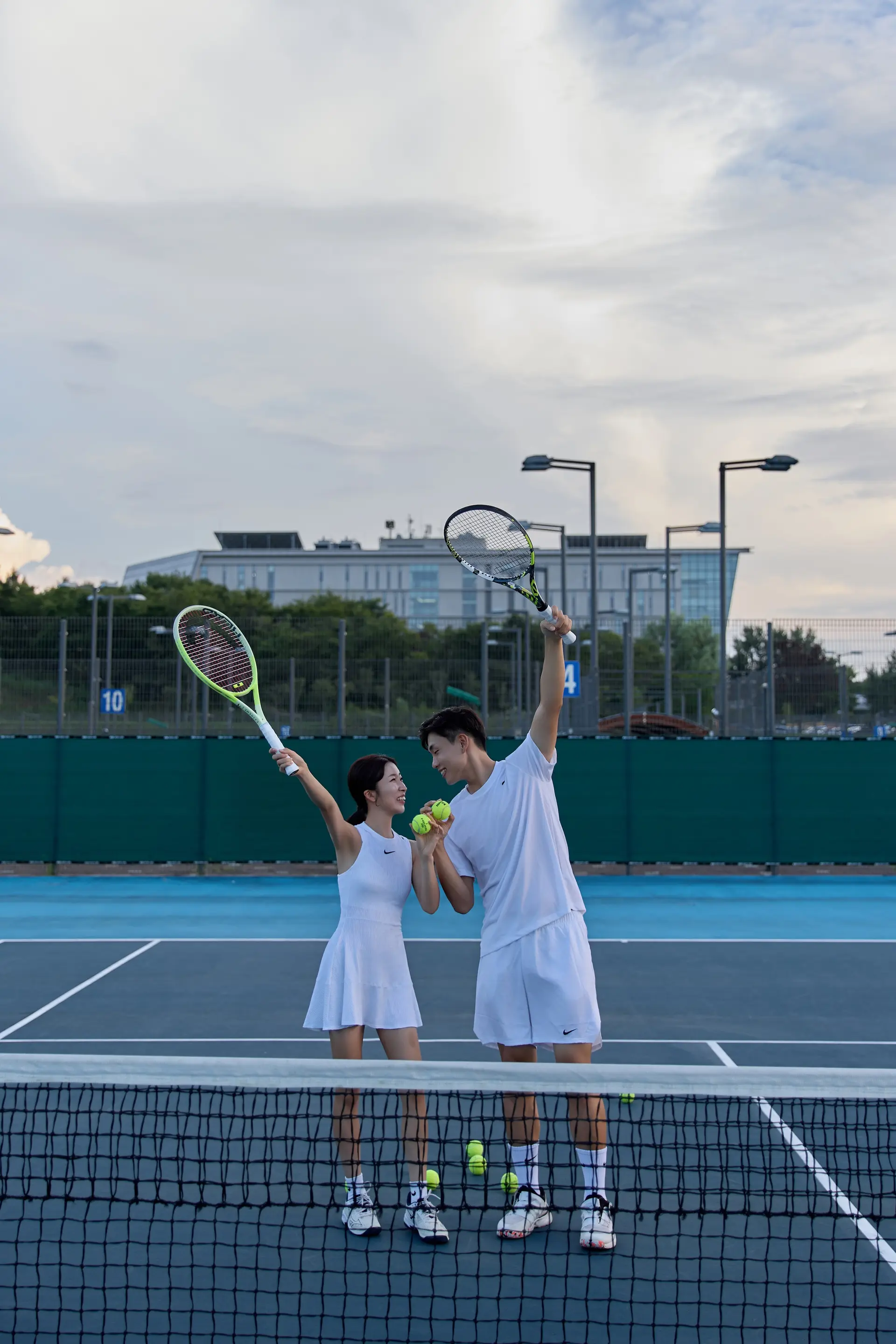 "처음에는 테니스장에서 웨딩 촬영이 괜찮을까 걱정했는데, 결과물을 보고 정말 만족했어요. 일몰 직전에 찍은 네트 앞 사진은 저희 커플 그 자체라 액자로 제작해 집에 걸어두었답니다. 저희를 가장 잘 아는 장소에서 찍길 정말 잘한 것 같아요!"