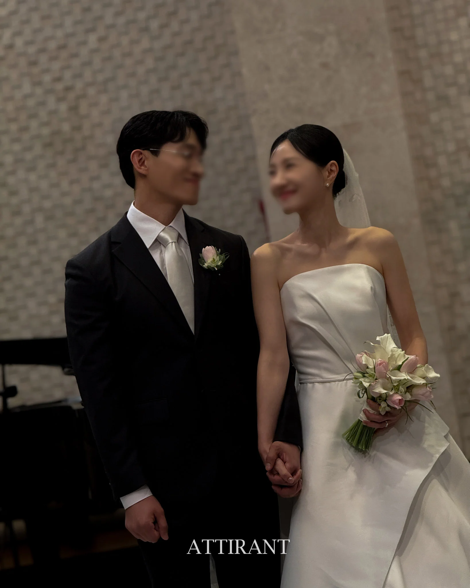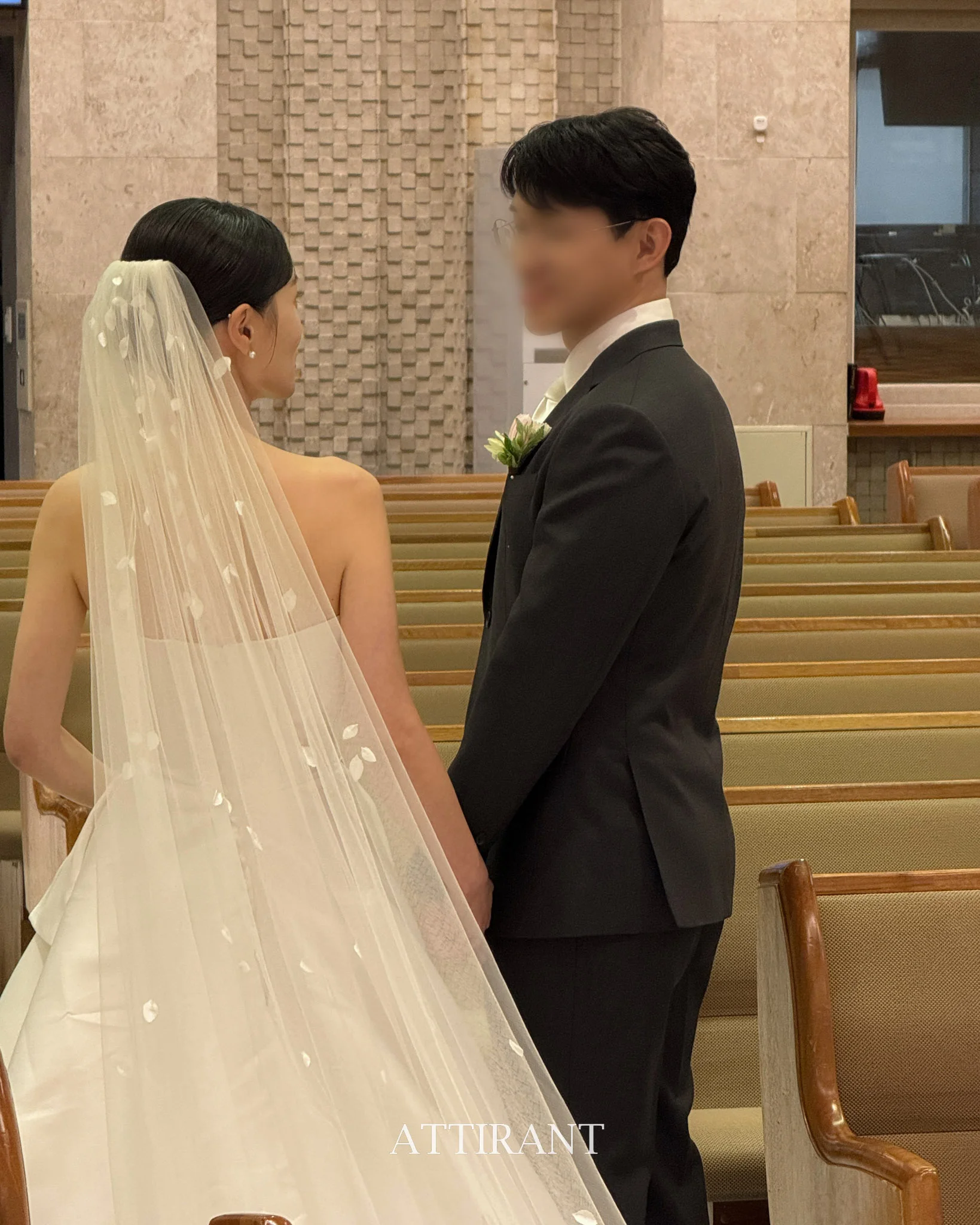 교회의 높은 층고와 나무 질감의 인테리어에는 화려한 비즈보다는 실크 소재나 단아한 레이스 디테일의 드레스가 잘 어울립니다. 빛을 부드럽게 머금는 소재는 아뜨랑트스냅 특유의 따뜻한 보정 톤과 만났을 때 극강의 시너지를 발휘합니다.