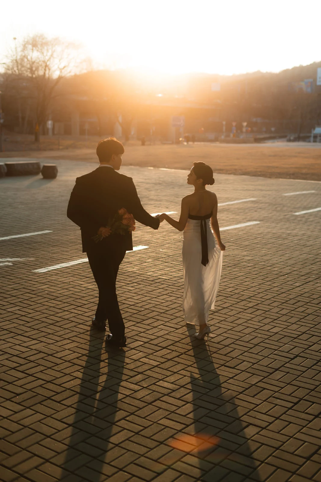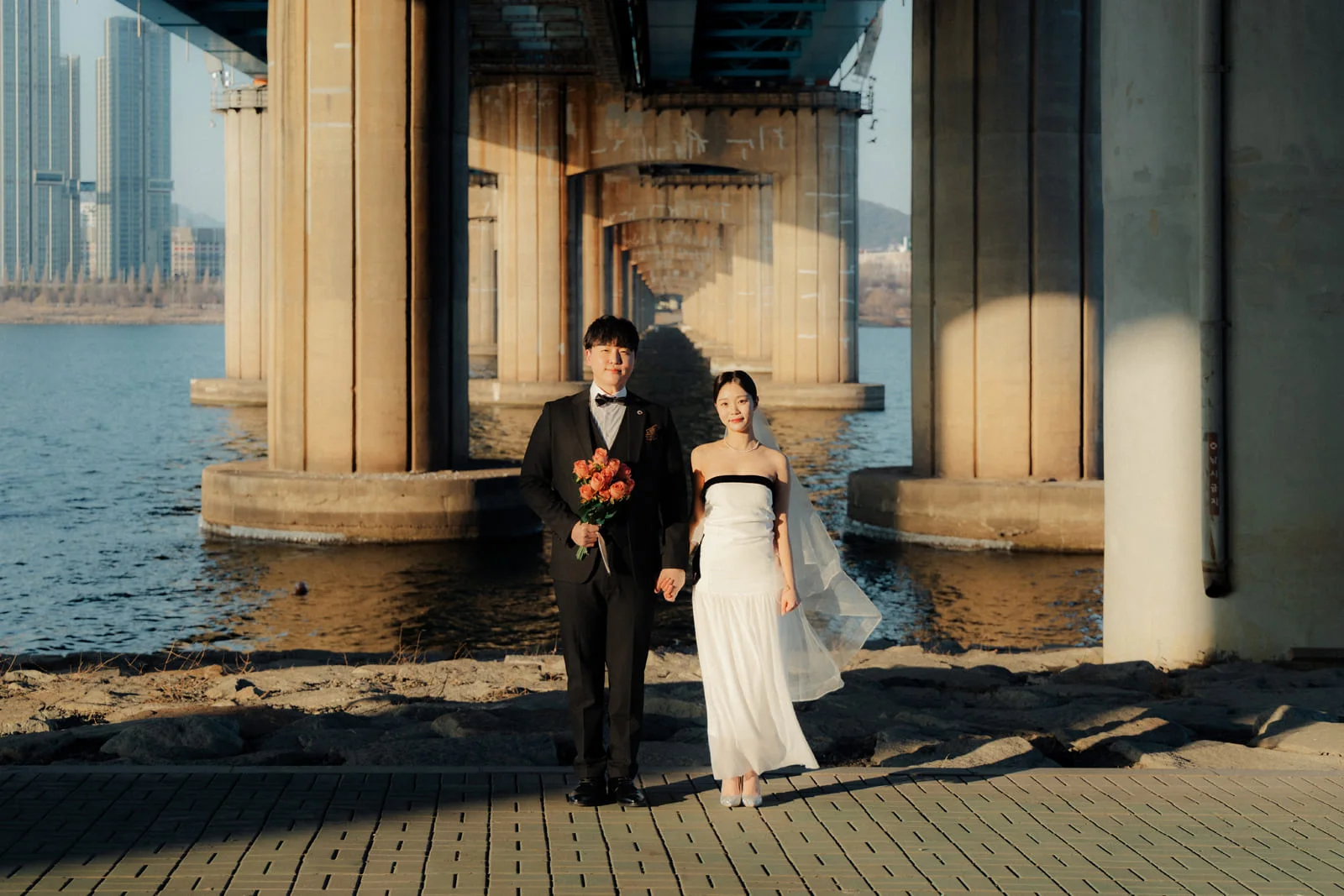 스타일리시한 조화: 화이트 드레스도 예쁘지만, 동작대교 특유의 차갑고 도시적인 질감에는 블랙 계열의 의상이 훨씬 화보 같은 아우라를 선사합니다.