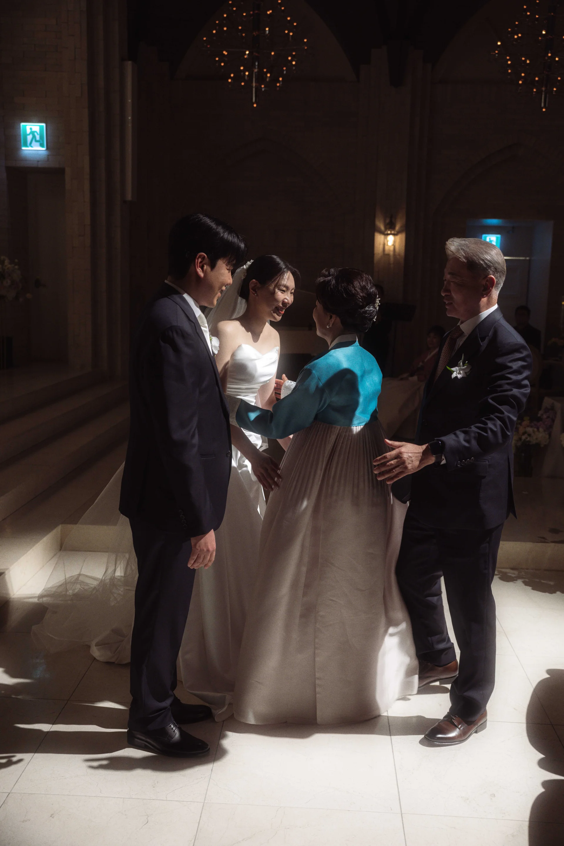 공간이 넓어 신부 단독 컷뿐만 아니라 가족, 하객과의 인터랙션을 담기에 매우 용이합니다. 인위적인 연출보다는 대화하며 환하게 웃는 찰나를 포착하는 데 공을 들입니다.