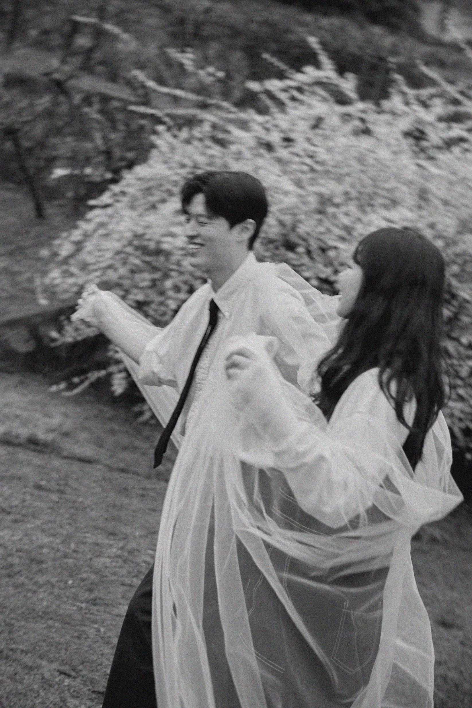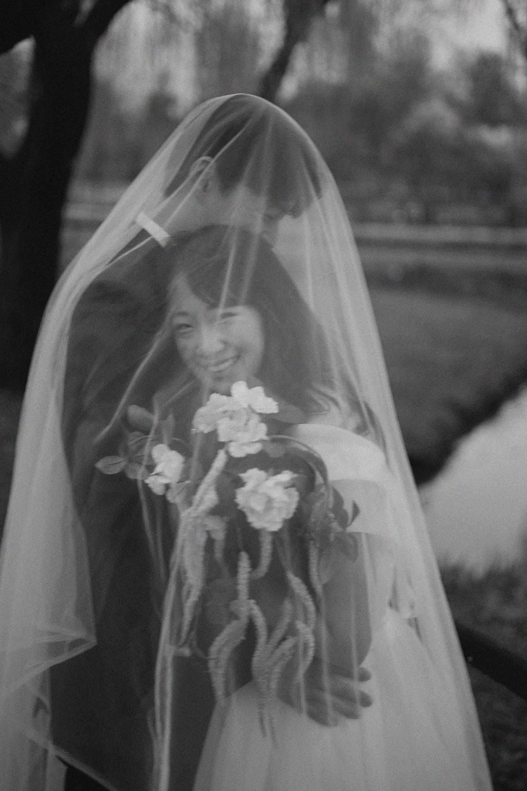 캐주얼한 촬영 후에는 호수 근처 버드나무 아래에서 클래식한 드레스 촬영을 이어갔습니다. 전날 내린 봄비 덕분에 한층 짙어진 공기와 색감은 사진에 깊이감을 더해주었죠. 베일을 활용한 연출은 자칫 단조로울 수 있는 야외 배경에 우아함을 불어넣는 신의 한 수가 되어주었습니다.