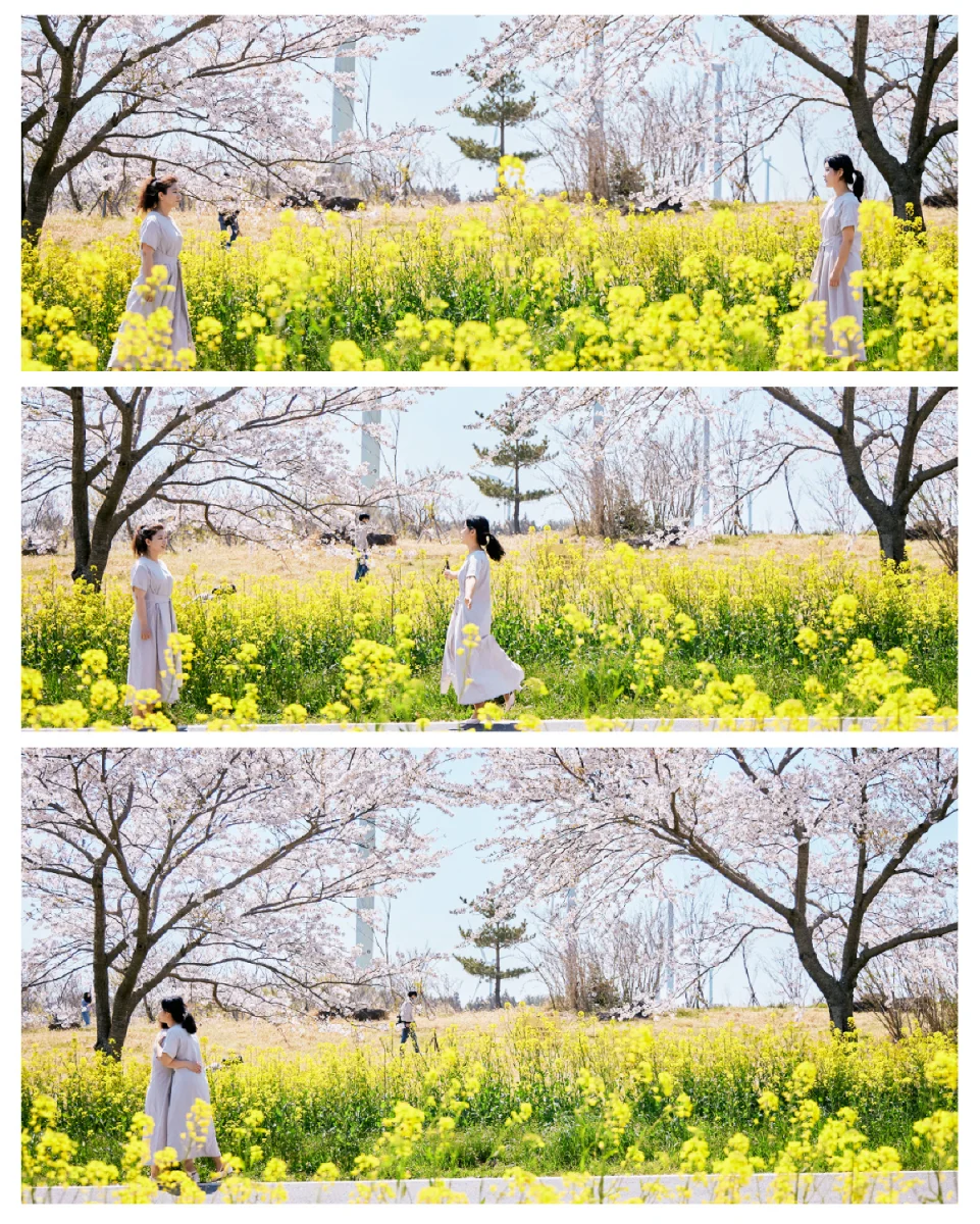 의상 컬러 | 화이트, 아이보리, 연한 파스텔 톤 | 분홍빛 벚꽃 배경과 대비되어 화사하고 깨끗한 무드 극대화 |