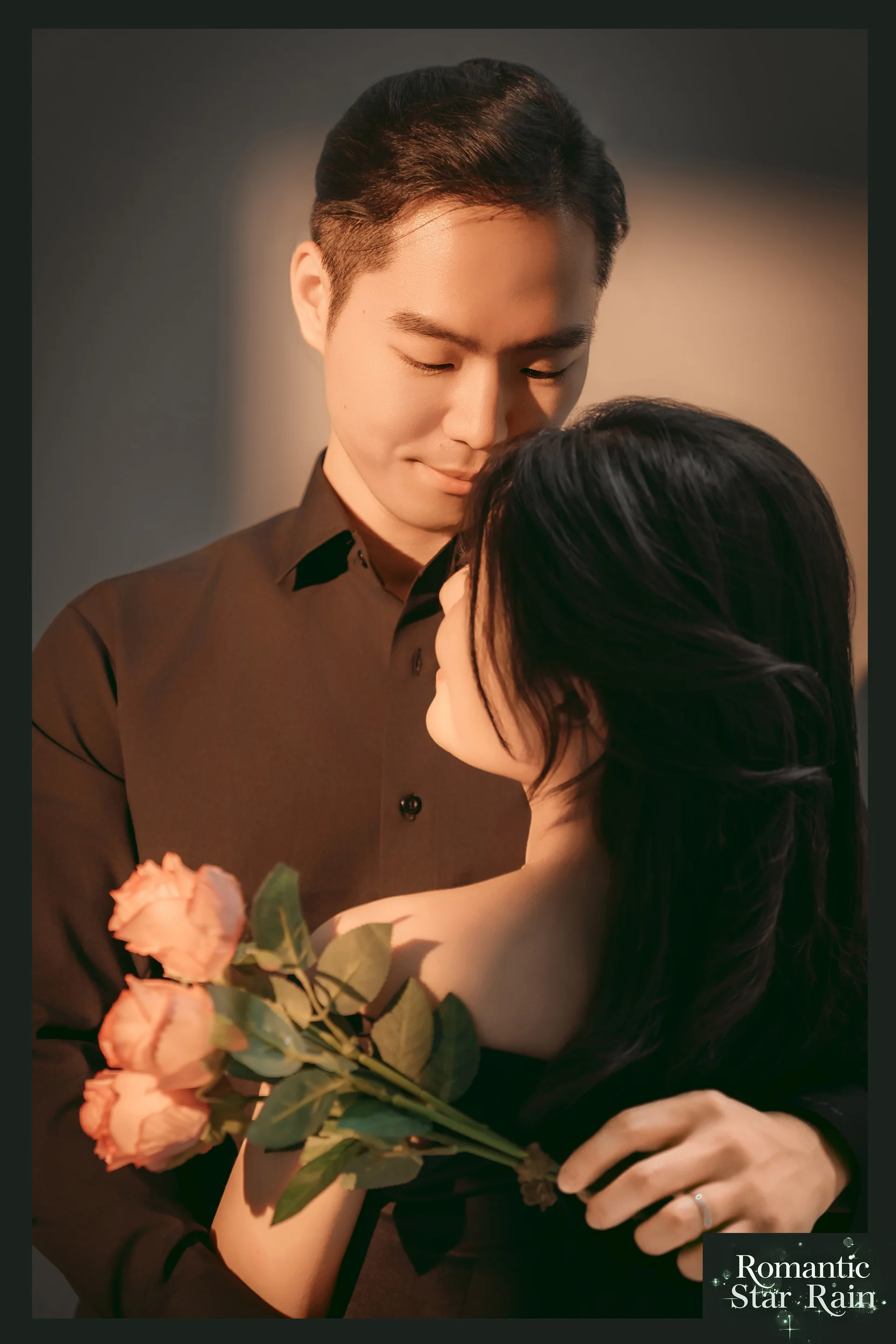 소품은 많을수록 좋은 것이 아니라, 컨셉과 얼마나 잘 어우러지는지가 중요합니다. 낭만별비는 이번 촬영에서 붉은 장미를 포인트 소품으로 제안했습니다. 검정 드레스와 붉은 장미의 강렬한 색채 대비는 사진 전체에 세련된 긴장감을 부여하며, 정형화된 포즈 없이도 두 분의 관계를 상징하는 시각적 매개체가 되어주었습니다.