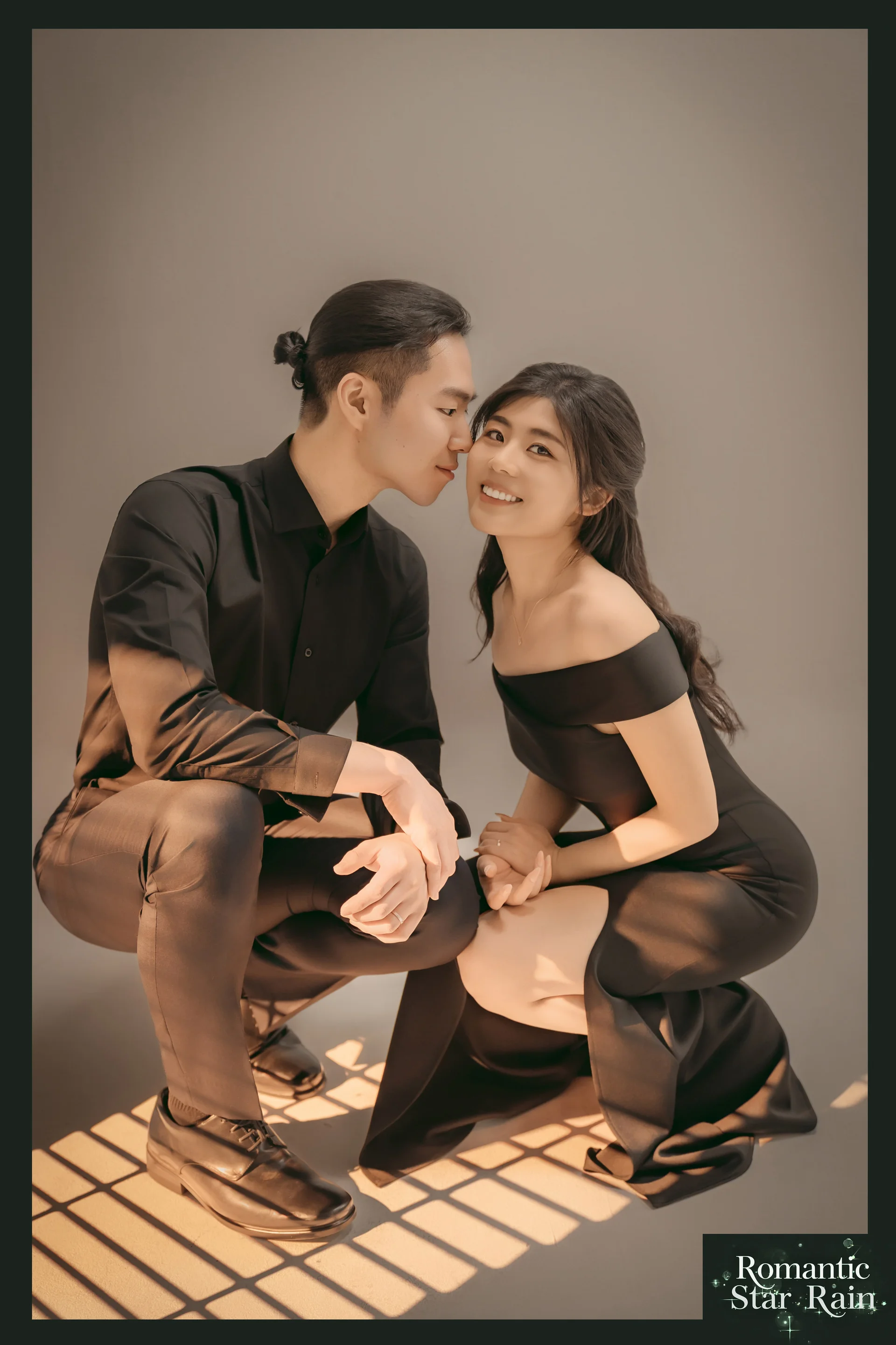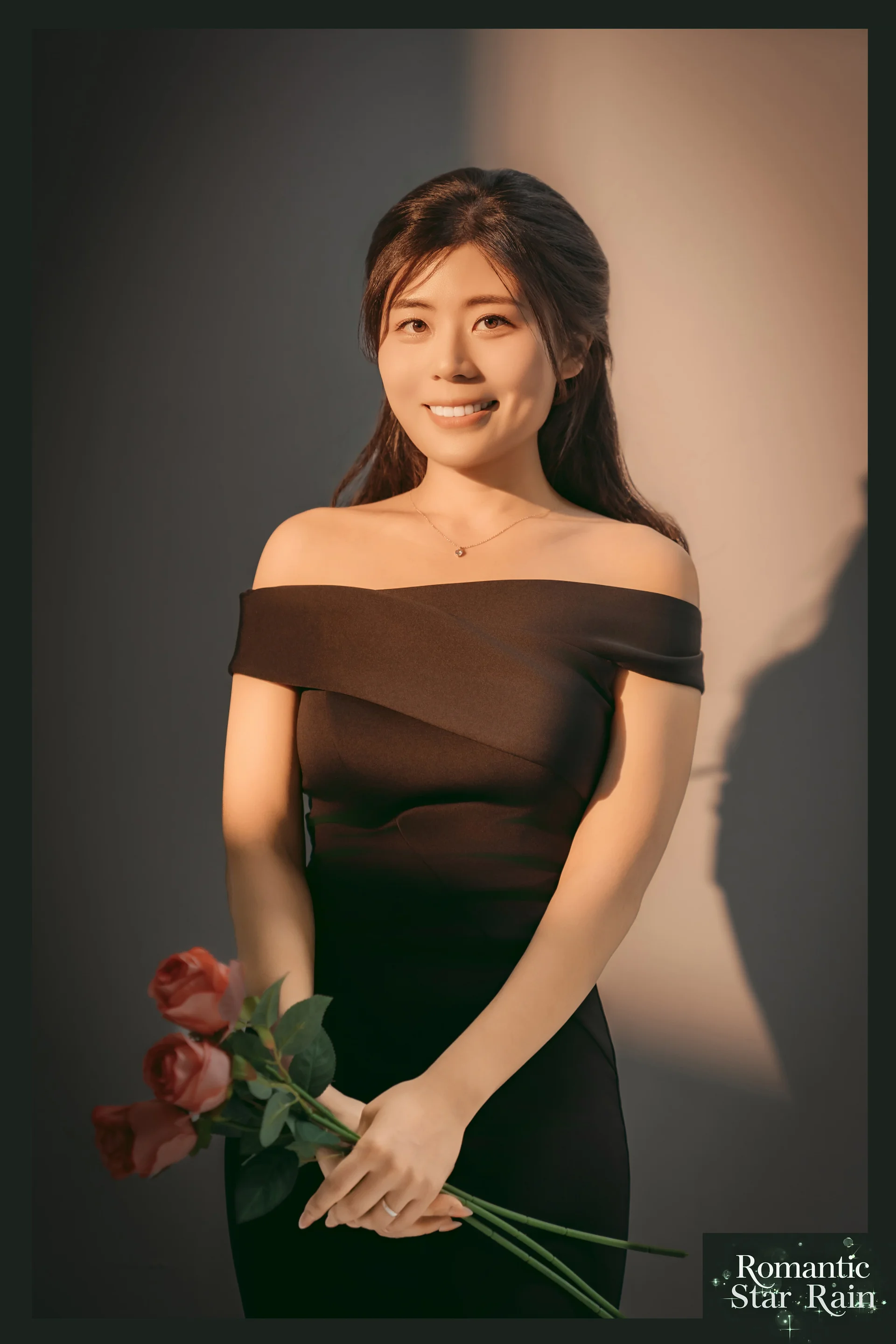 이번 촬영의 백미는 조명을 활용한 '블라인드 그림자' 연출이었습니다. 창문을 통해 들어오는 듯한 절제된 빛과 인공적인 그림자의 조화는 평면적인 사진에 입체감을 불어넣었죠. 낭만별비 스튜디오는 인물의 실루엣을 따라 흐르는 빛의 선을 포착하여, 검정 드레스가 가진 우아하고 신비로운 무드를 극대화했습니다.