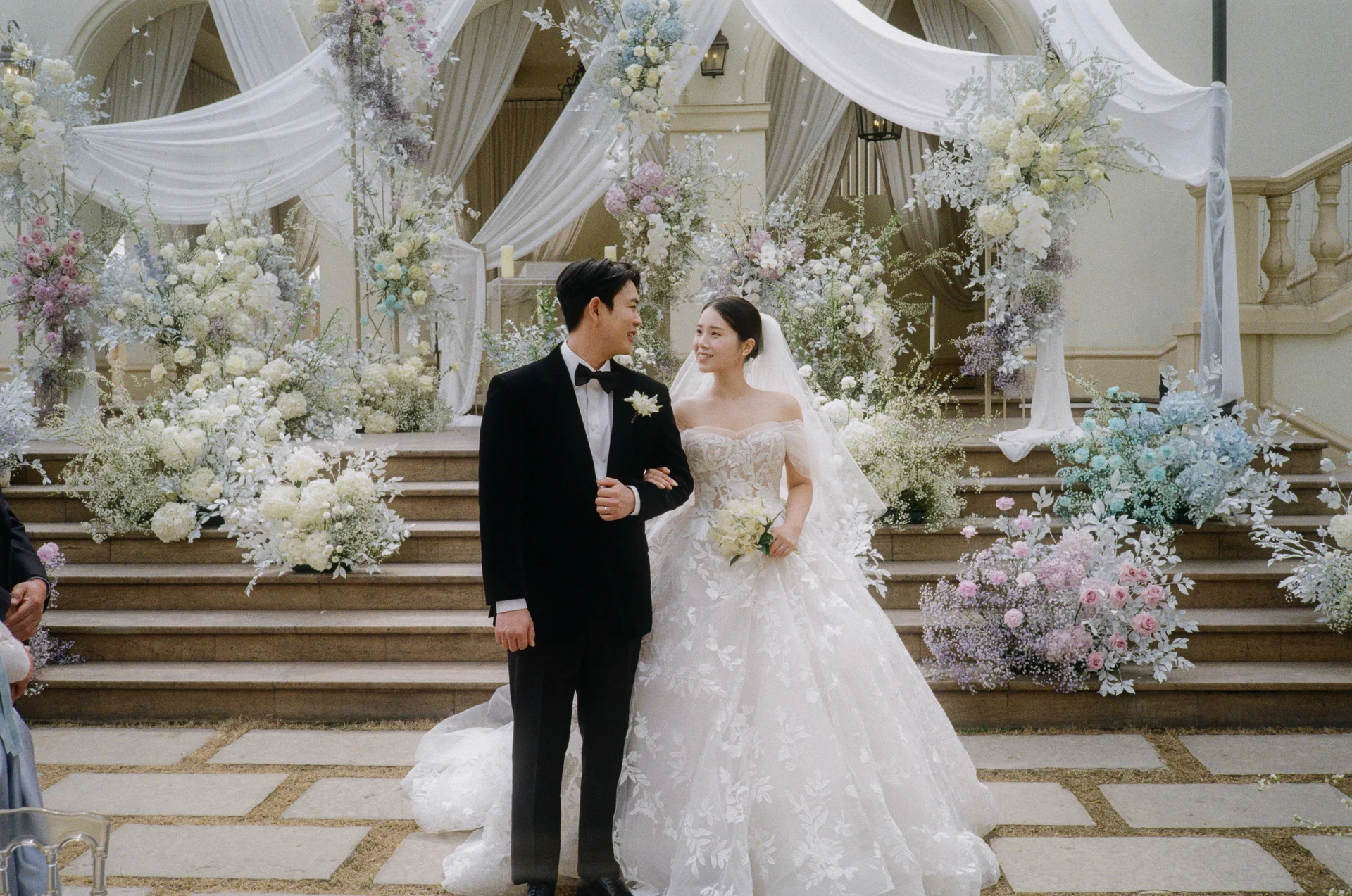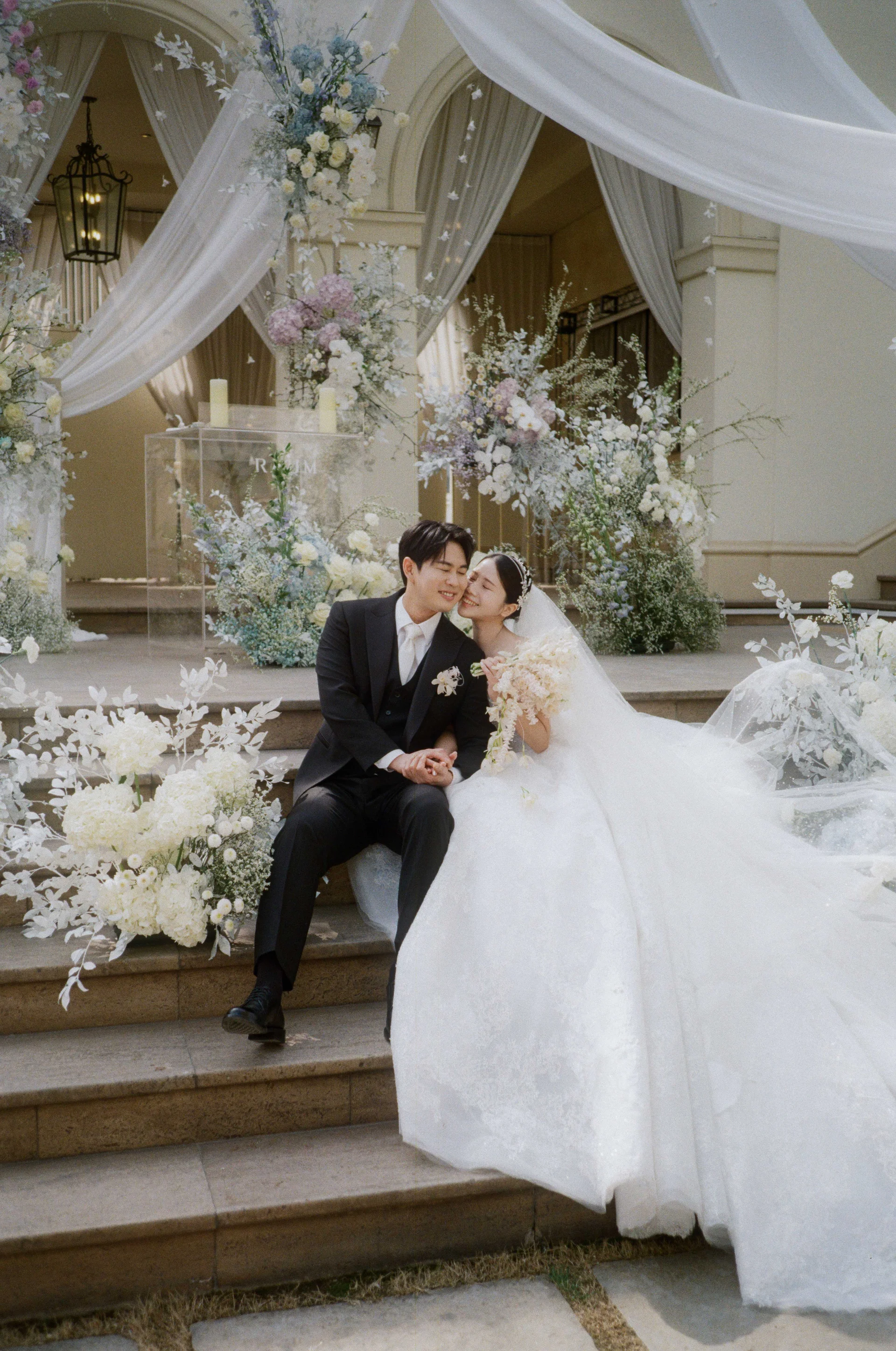 예식 공간에서 4층 연회장으로 이어지는 동선은 마치 하나의 전시 동선처럼 매끄럽고 웅장합니다. 4층 공간은 높은 층고와 고풍스러운 인테리어 덕분에 예식 이후의 피로연 장면까지도 하이엔드 화보 같은 느낌을 자아냅니다. 오프그리드는 이러한 전체적인 동선을 따라가며 일관된 감성을 유지합니다.