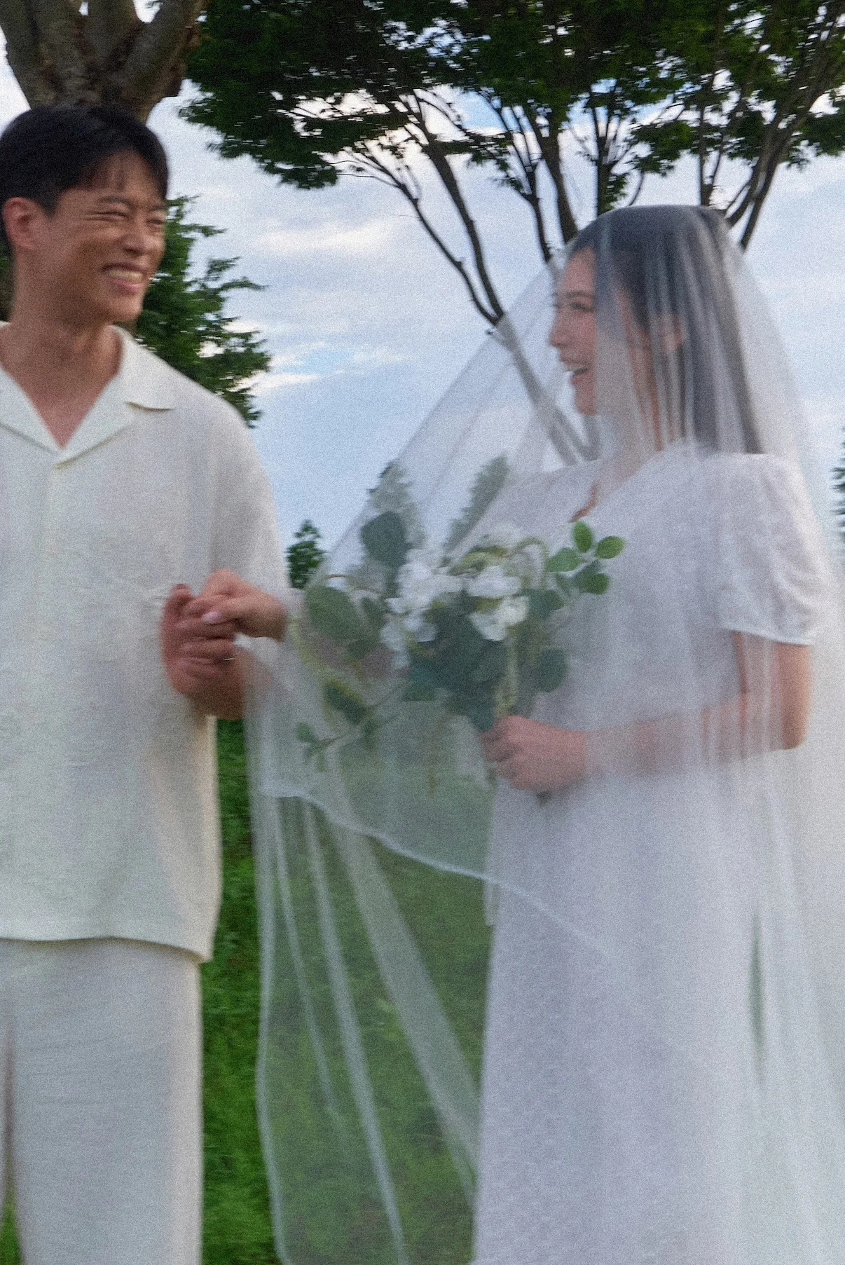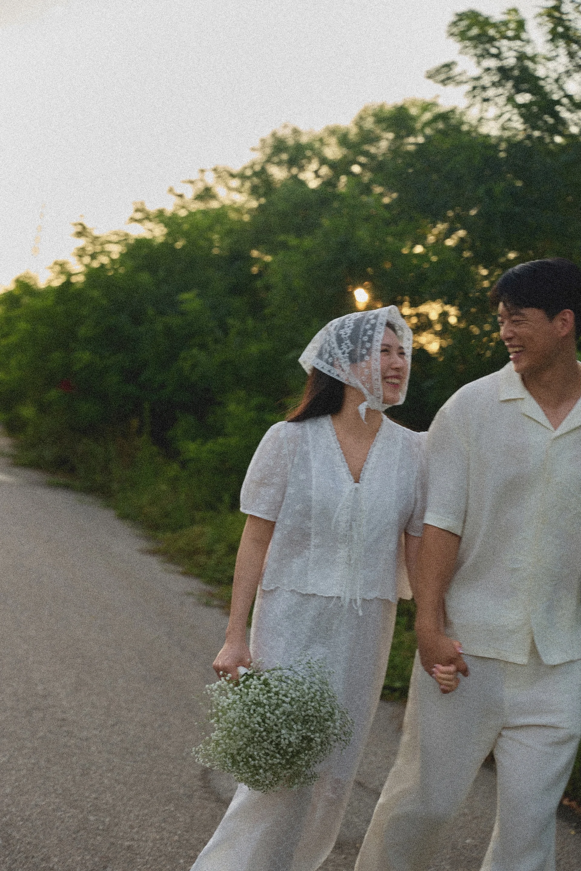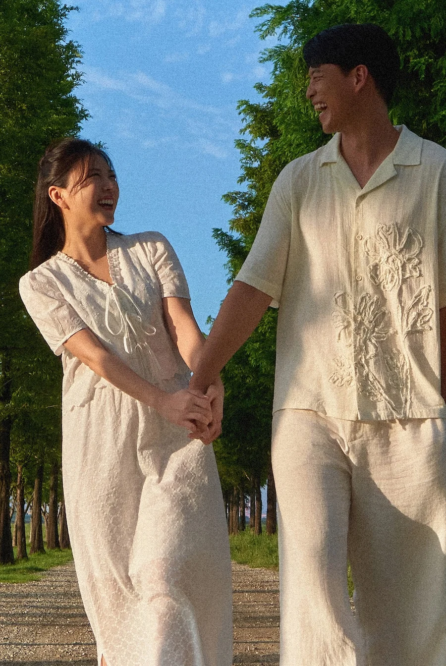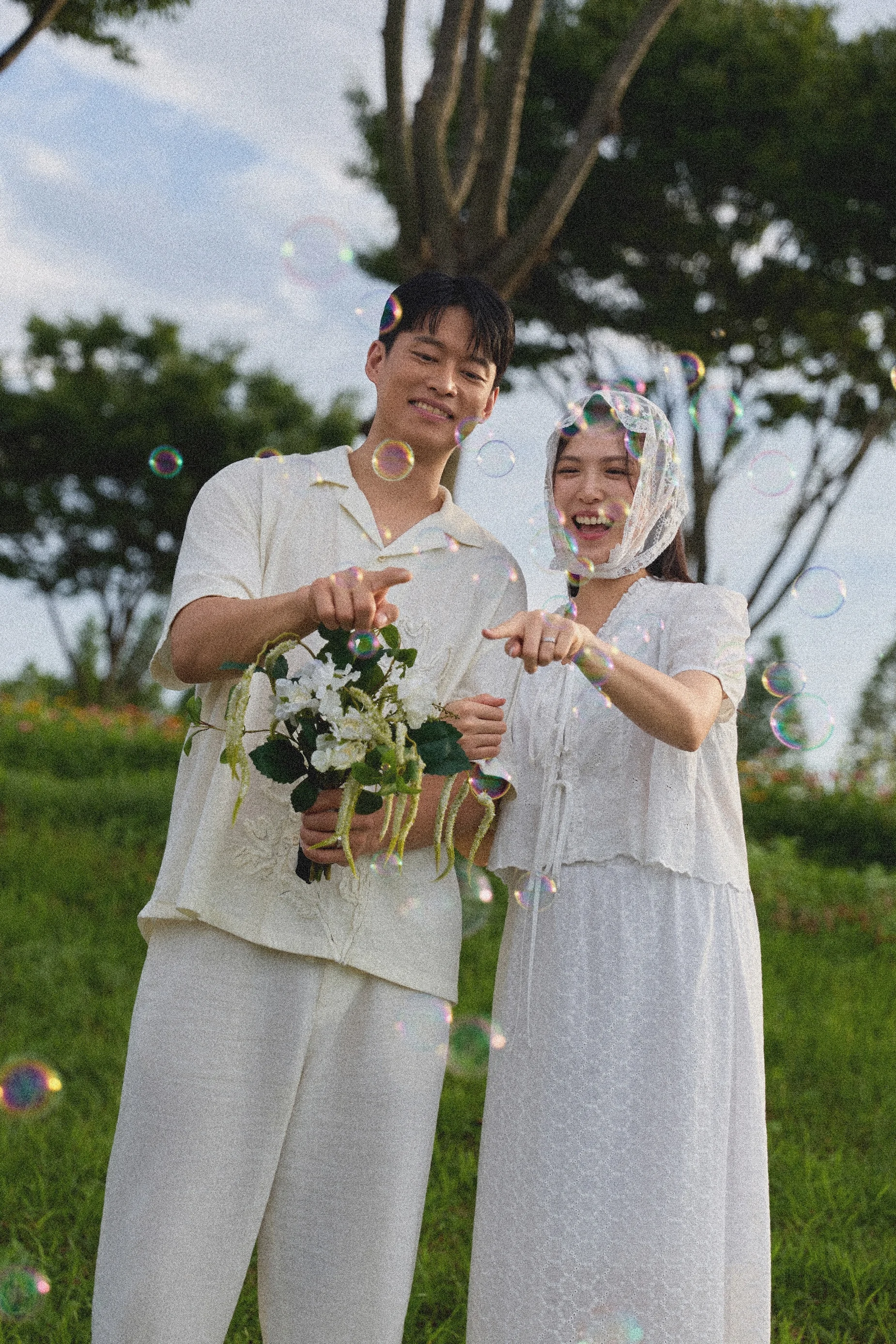 캐주얼 촬영은 자칫 밋밋해질 수 있습니다. 하기스스냅은 생화 부케로 색감 포인트를 주고, 베일이나 헤어두건을 활용해 한 장소에서도 여러 벌의 옷을 입은 듯한 스타일 변화를 이끌어냅니다. 또한 비눗방울을 이용한 연출은 두 분의 긴장을 풀어주는 동시에 동화 같은 생동감을 사진에 더해주는 훌륭한 장치가 되었습니다.