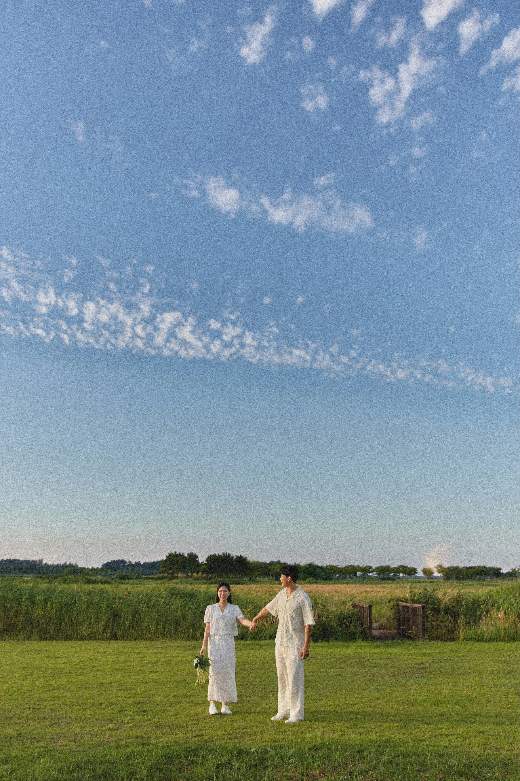 이번 촬영의 신의 한 수는 드레스와 턱시도 대신 선택한 캐주얼 의상이었습니다. 신부님의 가벼운 원피스와 신랑님의 아이보리 톤 캐주얼은 대부도의 초록 들판 및 파란 하늘과 완벽하게 어우러졌습니다. 의상이 가벼워진 만큼 두 분의 움직임은 더 자유로워졌고, 이는 곧 자연스러운 결과물로 이어지는 선순환을 만들었습니다.
