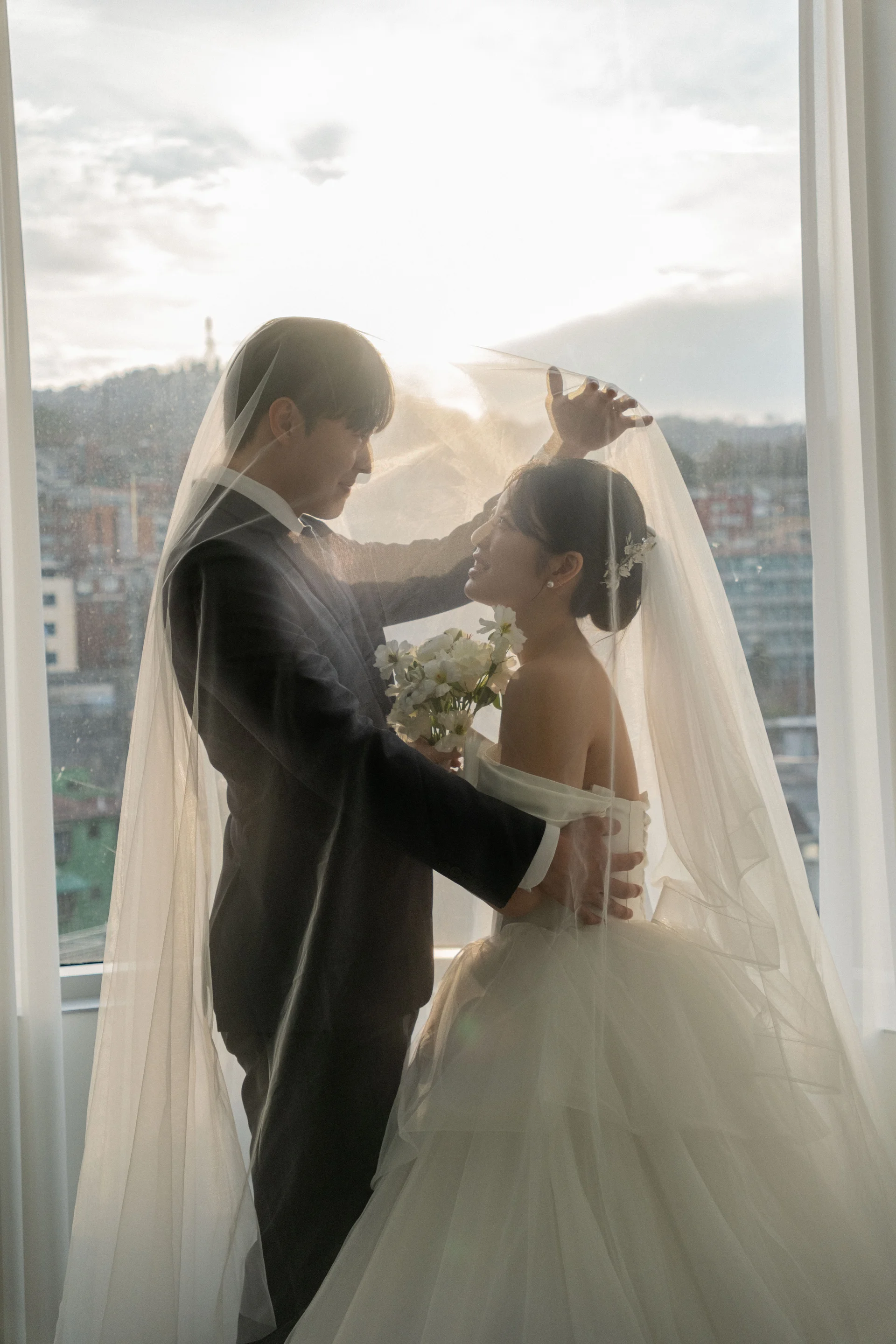 얇은 베일은 빛을 머금었을 때 그 진가를 발휘합니다. 소유필름은 창을 통해 들어오는 자연광의 각도를 계산하여 베일의 질감을 부드럽게 살려냈습니다. 특히 노을이 지는 골든아워에는 따뜻한 오렌지빛 톤을 입혀, 몽환적이고 사랑스러운 분위기를 극대화하는 보정 기술을 적용합니다.