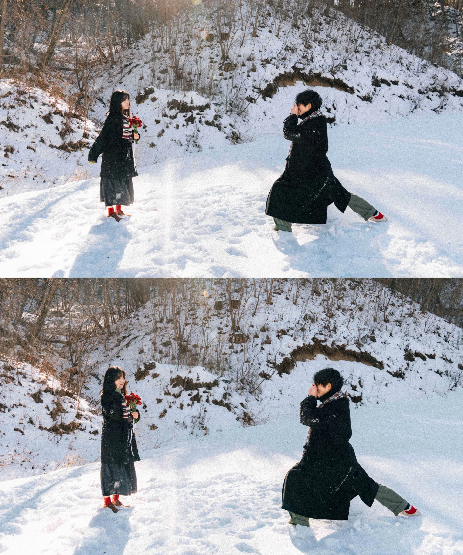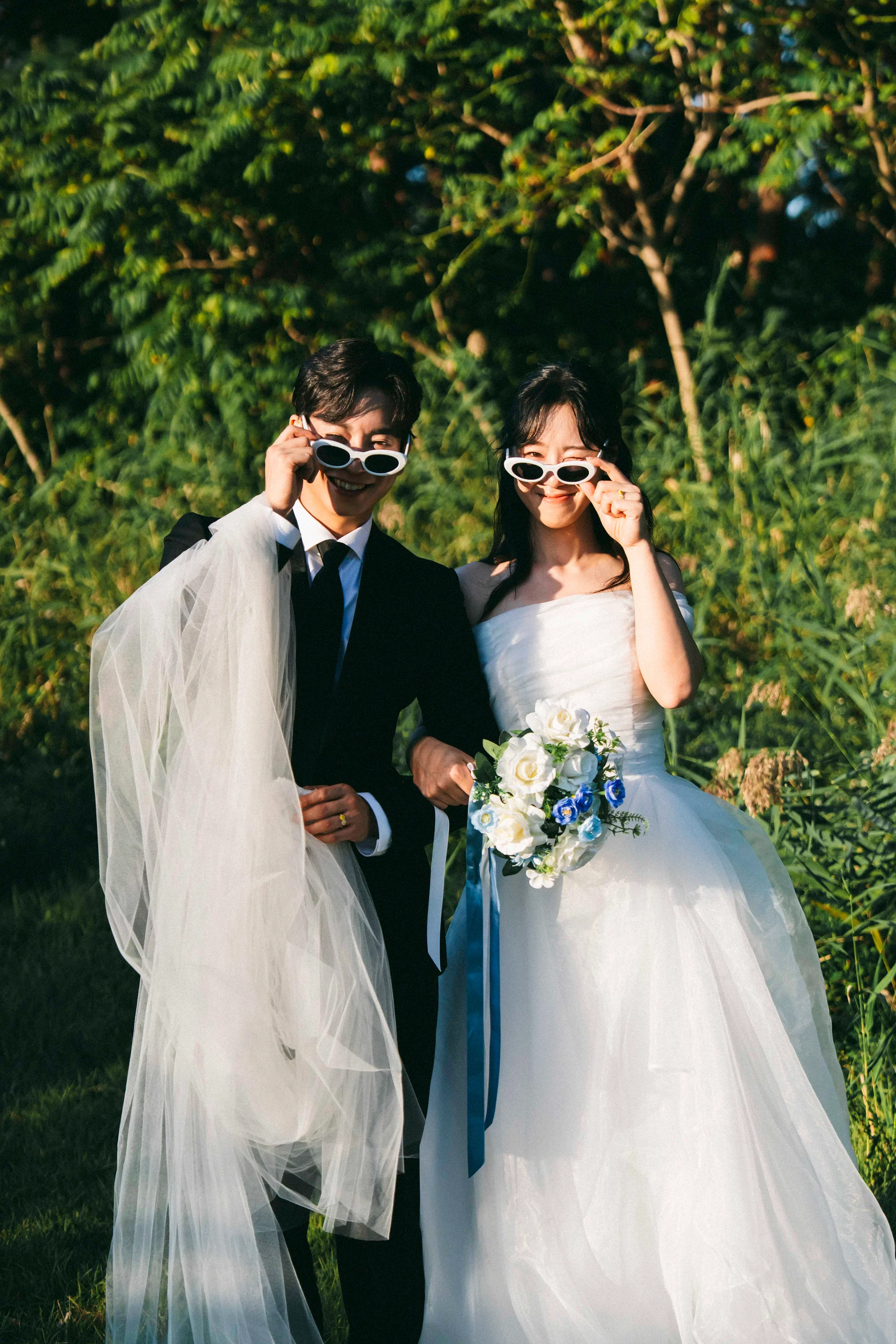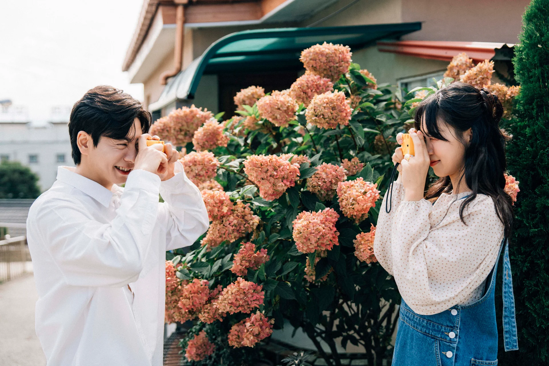 자연스러운 미소가 어려운 촬영 초반, 선글라스는 표정을 편안하게 풀어주는 훌륭한 장치가 됩니다. 또한, 필름 카메라나 소형 카메라는 두 사람이 서로를 찍어주는 상황을 연출하여 인위적인 포즈 없이도 가장 '우리다운' 다정한 순간을 포착할 수 있게 돕습니다.