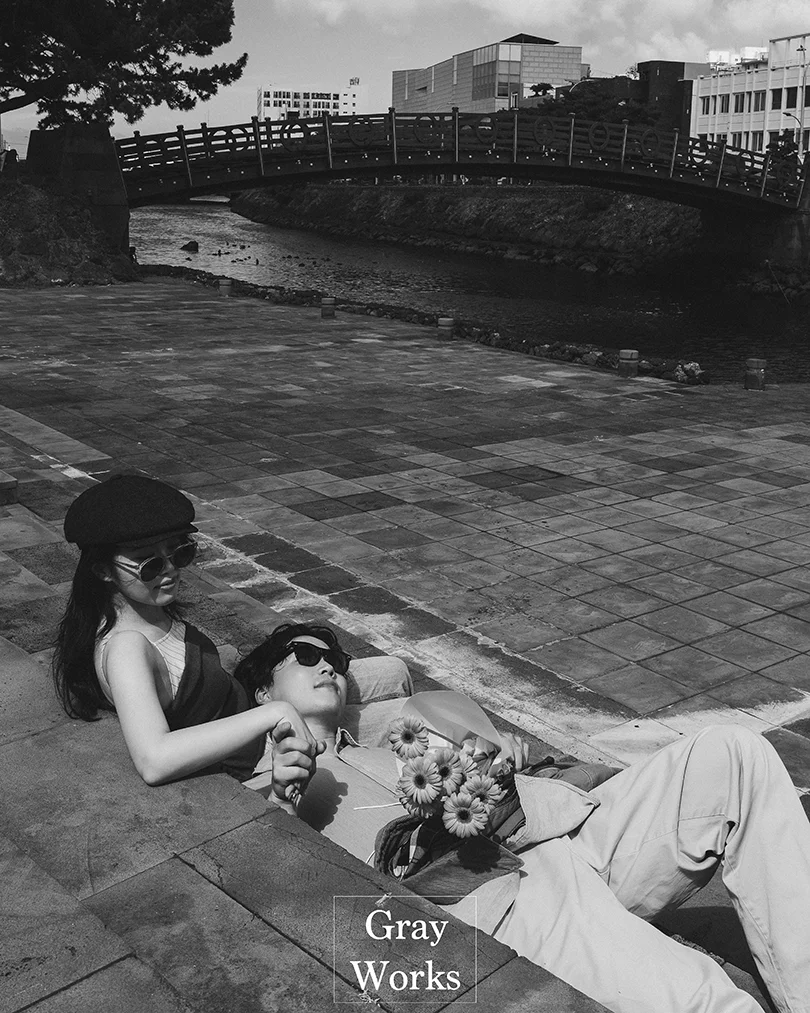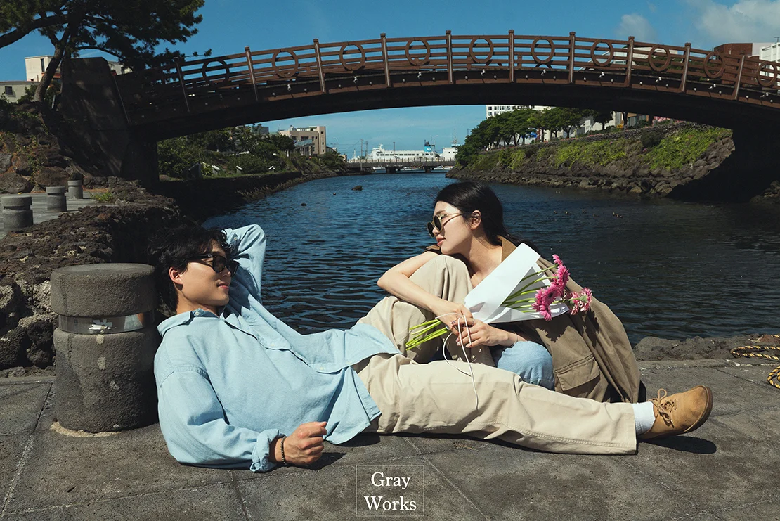 첫 번째 촬영지는 제주 도민들에게는 익숙한 동문시장 인근이었습니다. 평범해 보일 수 있는 작은 다리와 흐르는 물가지만, 그레이웍스의 시선은 이곳에서 영화 '노팅힐'의 이국적인 정취를 포착했습니다. 관광객이 붐비지 않는 히든 스팟을 활용해 두 분이 서로에게만 집중할 수 있는 환경을 조성했습니다.