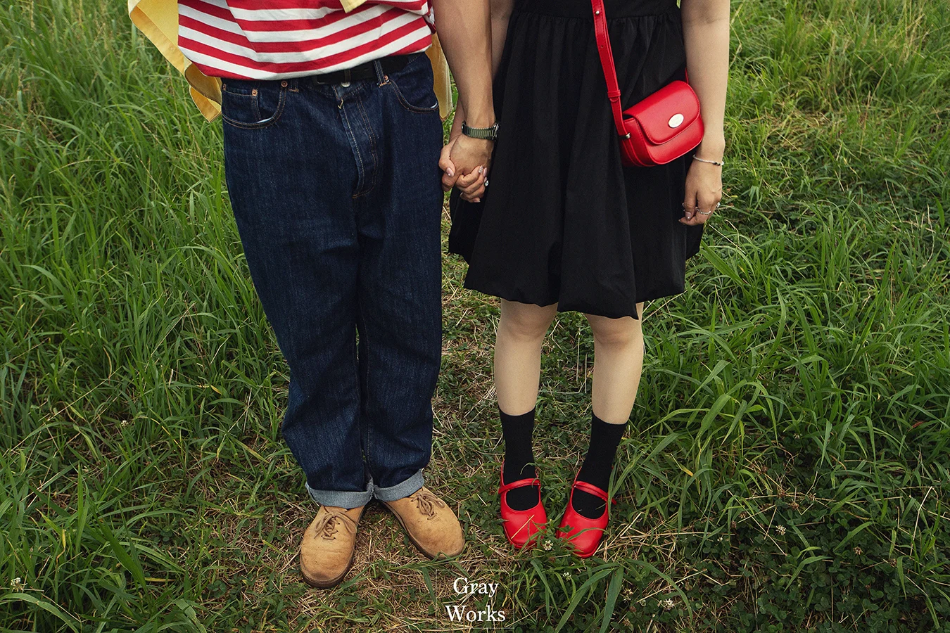 키키 컨셉을 위해 그레이웍스 팀은 직접 종이 박스 소품을 준비했습니다. 언덕 위에서 박스 썰매를 타며 내려오는 장면은 인위적인 포즈가 아닌, 두 분의 진짜 웃음과 에너지를 이끌어내는 결정적인 포인트가 되었습니다.