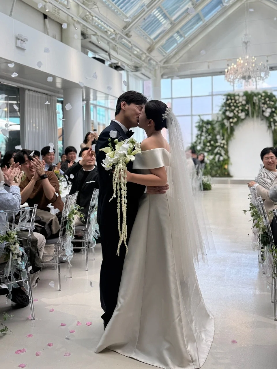 양쪽 테이블에 하객이 착석하고 중앙 통로를 따라 입장하는 구조는 하객과의 물리적 거리를 좁혀줍니다. 온미스냅은 하객들의 축복 어린 표정과 신랑신부님의 미세한 떨림이 교차하는 지점을 캔디드 기법으로 포착합니다. 특히 통로가 넓지 않은 구조적 특징을 고려하여, 메인 작가의 동선을 방해하지 않으면서도 가장 감성적인 서브 앵글을 선점합니다.