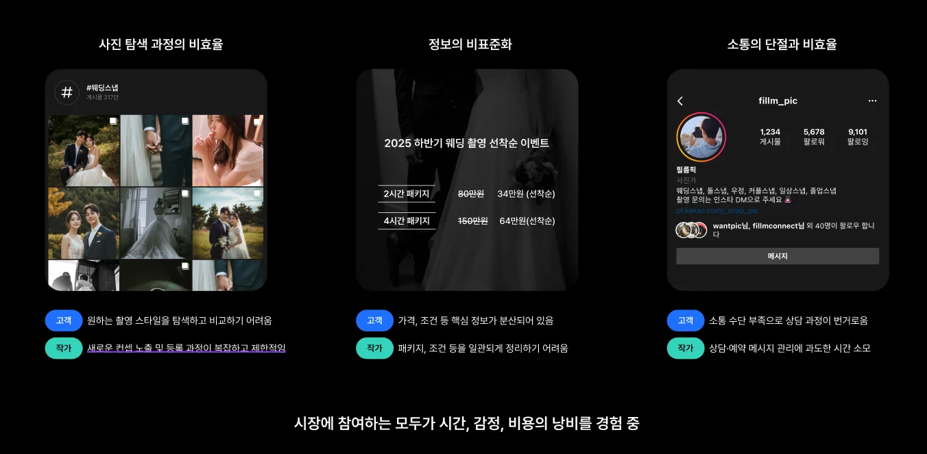 가격, 콘셉트, 작가 포트폴리오를 비교·분석하고 선택할 수 있는 투명한 정보 구조가 필요합니다.