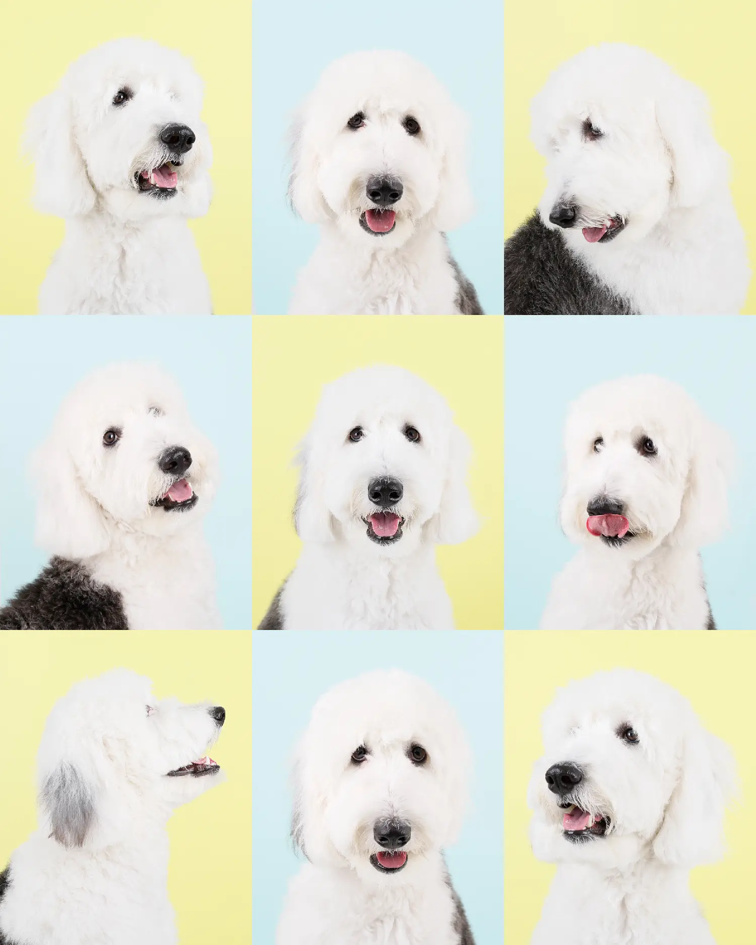 강아지의 다양한 표정을 9개의 프레임에 나눠 담는 시그니처 구성