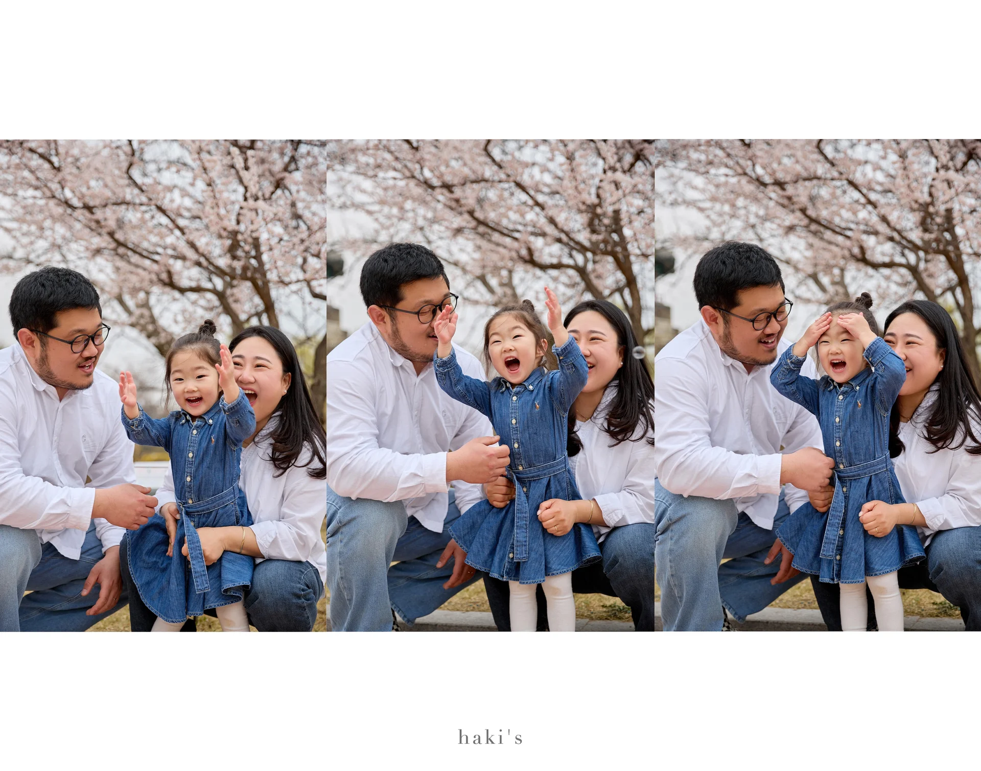 탁월한 선택: 형식적인 정장보다 아이와 함께 뛰어놀기에 편안한 데님 의상은 화사한 벚꽃 배경과 생동감 있게 어우러졌습니다.