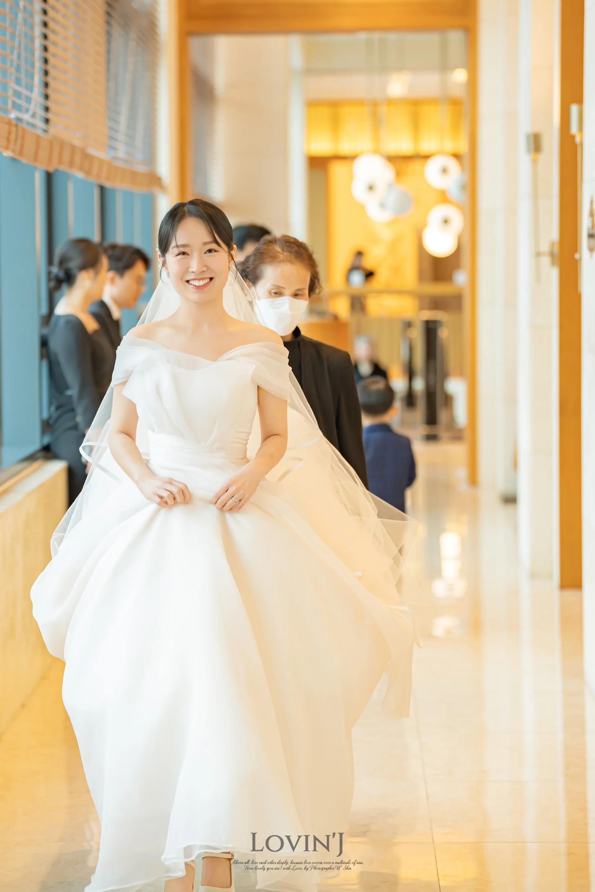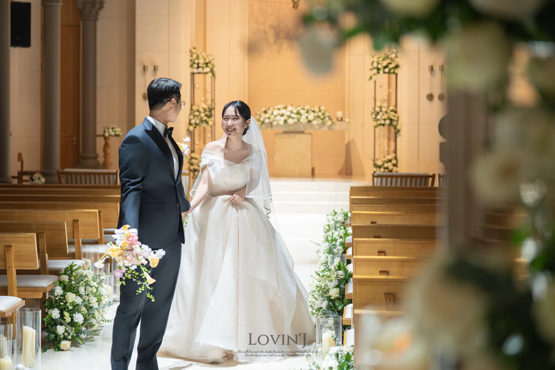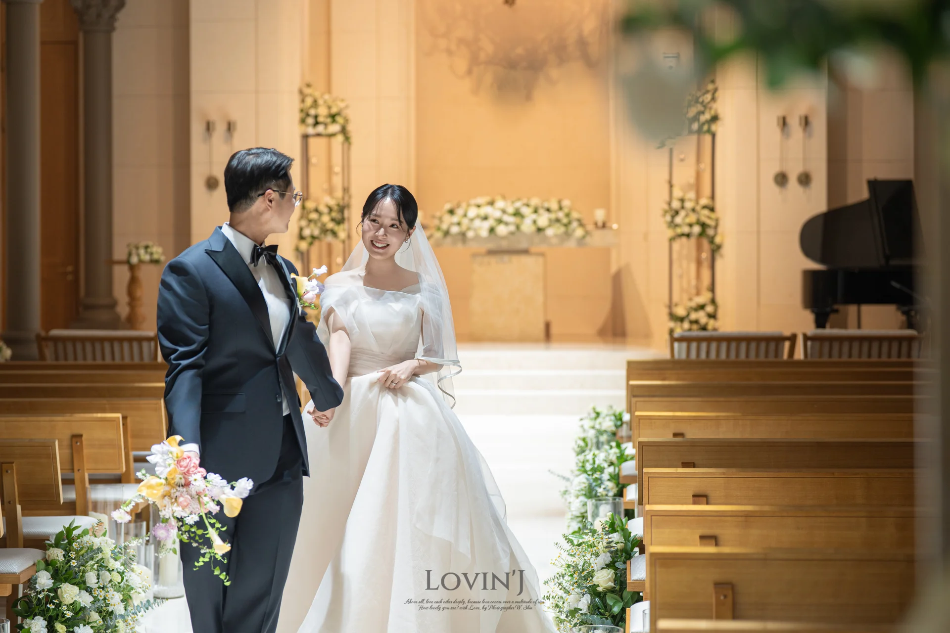A. 마리에홀 특유의 따뜻한 조명은 아이폰이나 일반 카메라로는 노랗게 보일 수 있습니다. 하지만 러빈제이스냅은 현장의 화이트 밸런스를 정밀하게 조정하고 후반 작업을 통해 신부님의 피부 톤을 가장 맑고 화사하게 잡아드립니다.