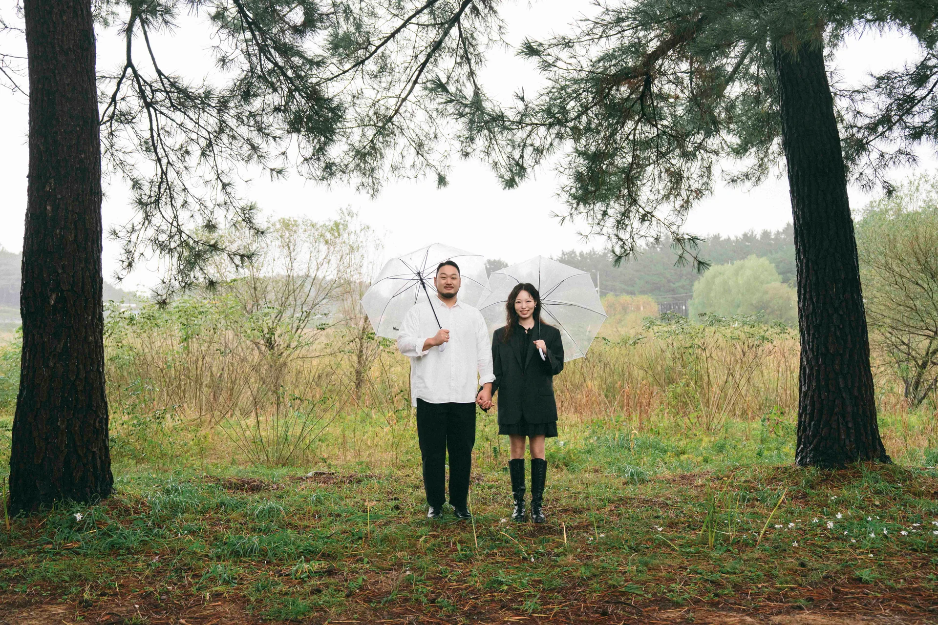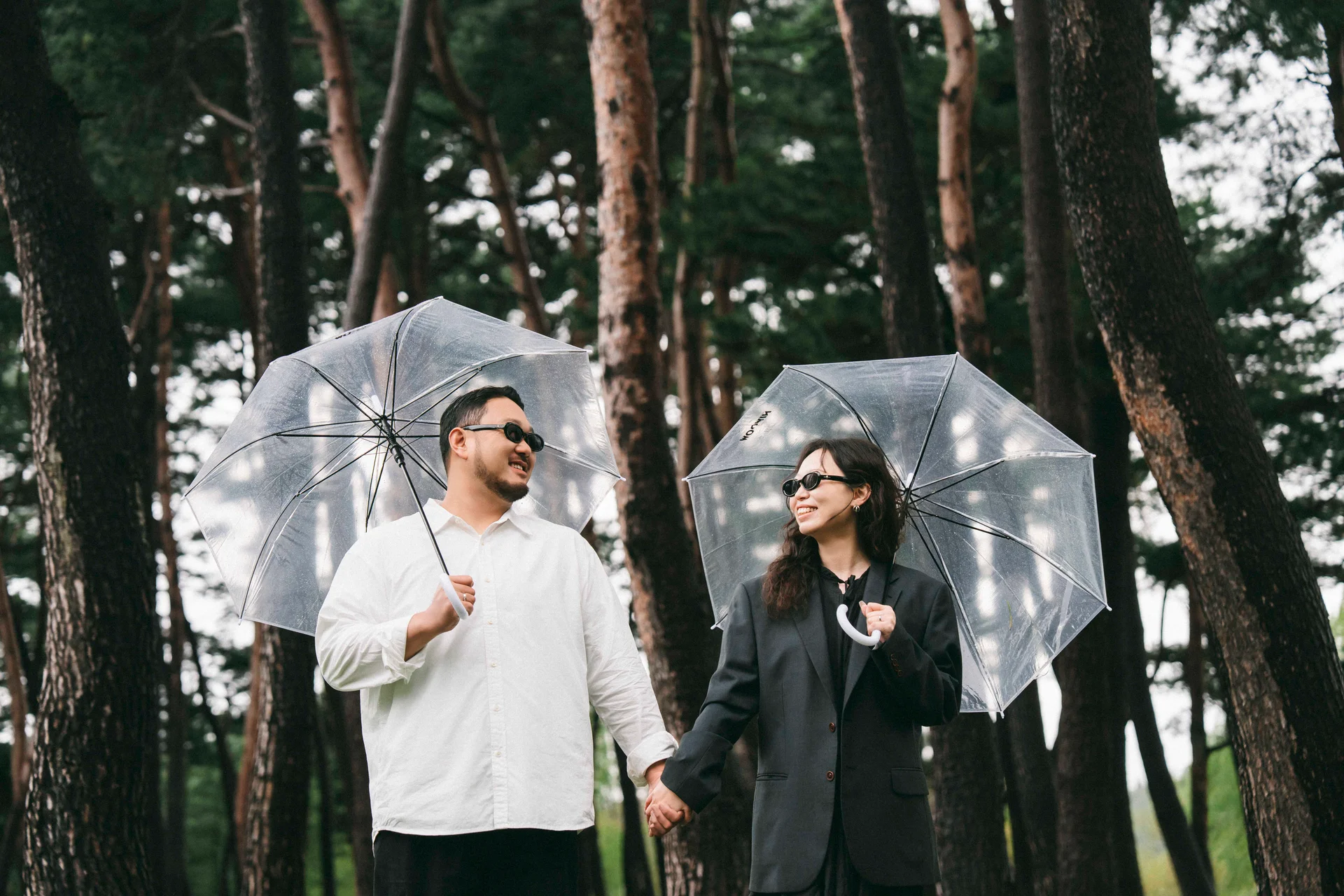 투명 우산은 단순한 방수 도구가 아닌, 두 사람의 거리감을 좁히고 친밀함을 강조하는 훌륭한 소품입니다. 우산 속에서 마주 보는 눈빛은 그 어떤 연출보다 로맨틱하게 담깁니다.